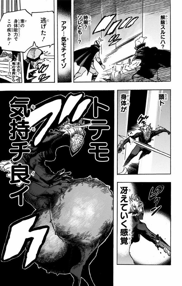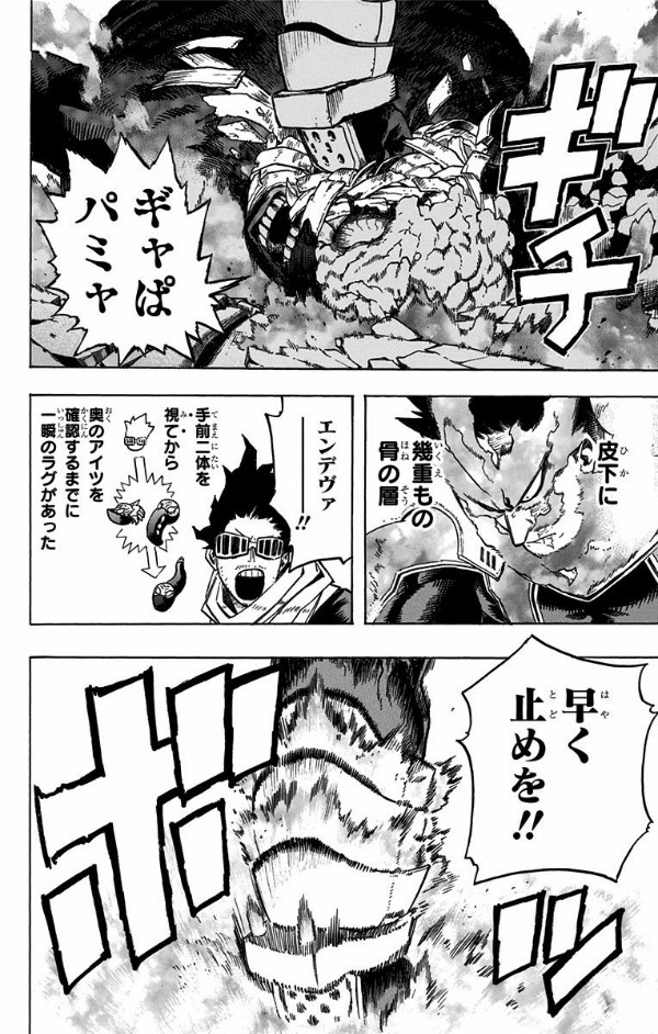 声の調子も最高潮! YEAHHHHHHH! “敵”も脳無もウジャウジャで、盛り上がってんな! 俺たちのような悪夢を繰り返さない為にも、ヤツらは必ずここで絶つ! だからあいつは…死柄木だけは絶対に起こすわけにはいかねぇ! “Plus Ultra”!!