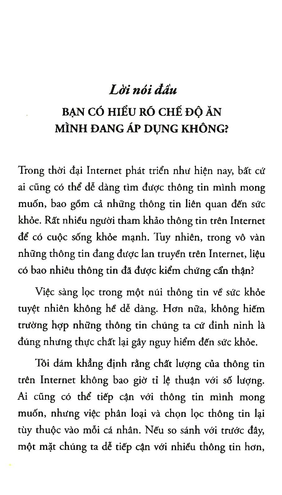 Ngay tại khoảnh khắc này, sức khỏe của chúng ta cũng đang tốt lên hoặc xấu đi. Không ai có thể thoát khỏi quy luật, chúng ta phải chăm sóc sức khỏe từng ngày. Nếu bạn quan tâm đến thói quen ăn uống hằng ngày, đang mắc bệnh nặng hoặc nhẹ, hoặc muốn tránh những kiến thức sai lệnh về sức khỏe, thông qua cuốn sách này, bạn sẽ tiếp cận được với những bí quyết sống khỏe mạnh và liệu pháp ăn uống chữa bệnh đúng đắn.