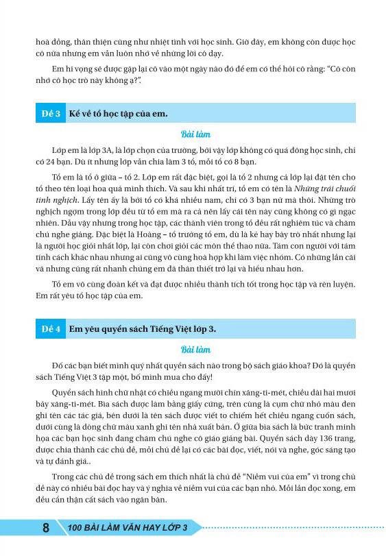 100 Bài Làm Văn Hay Lớp 3 Các em học sinh lớp 3 sẽ tìm thấy trong cuốn sách này cách hướng dẫn thực hiện một bài văn kể chuyện và Tập làm văn theo