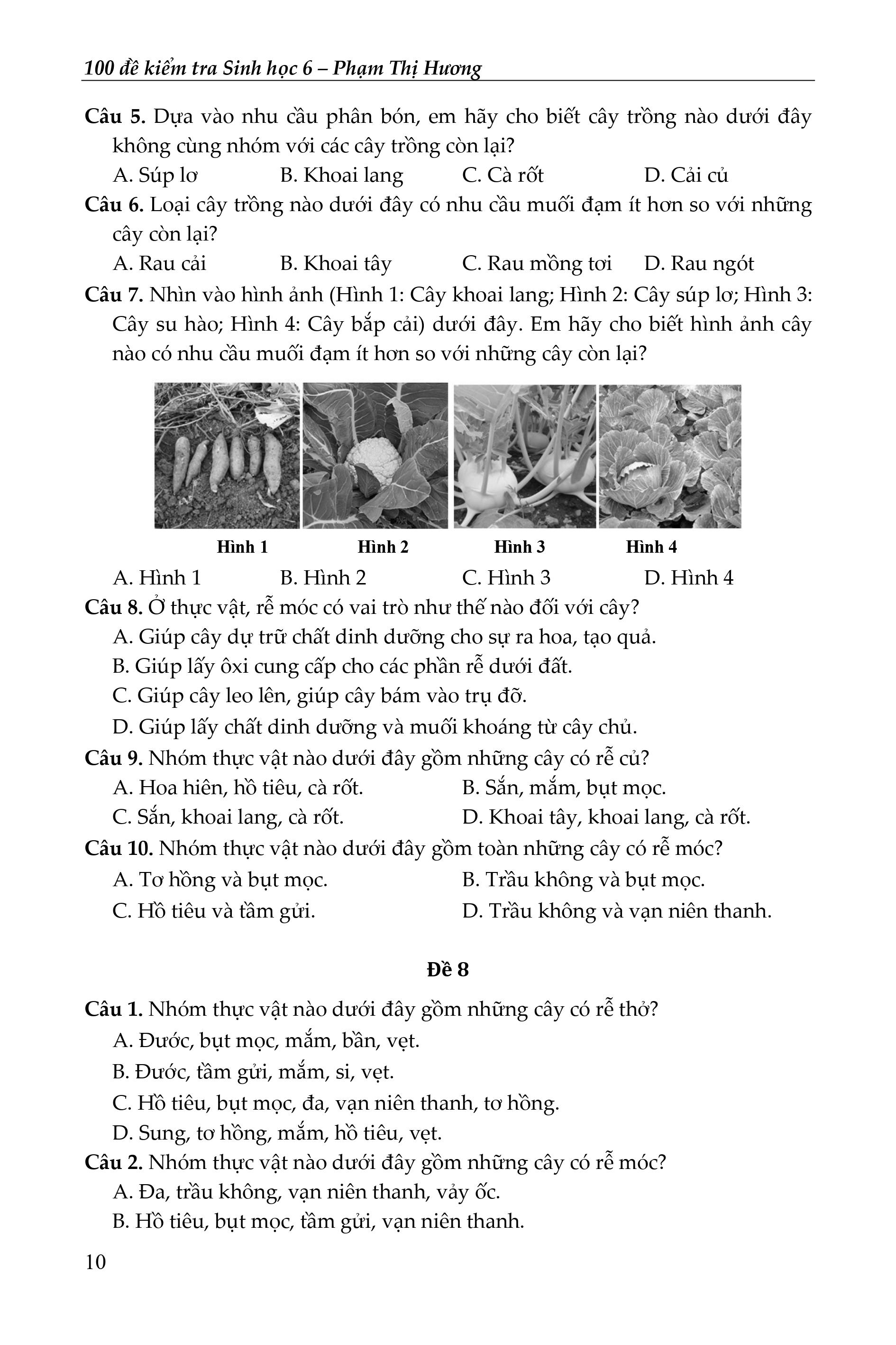 Để tạo điều kiện cho học sinh dễ dàng học tập và vượt qua những bài kiểm tra môn Sinh học lớp 6, giúp các thầy cô giáo và các bậc phụ huynh có thêm tài liệu hướng dẫn học sinh và con em mình học tập, tôi biên soạn cuốn: “100 ĐỀ KIỂM TRA SINH HỌC 6”. Sách được biên soạn bám sát chuẩn kiến thức, gồm nhiều câu hỏi hình ảnh giúp học sinh hứng thú trong học tập. Ngoài ra còn những câu hỏi thực tế, vận dụng, mở rộng, phát huy được tính tích cực và tinh thần học tập của học sinh.