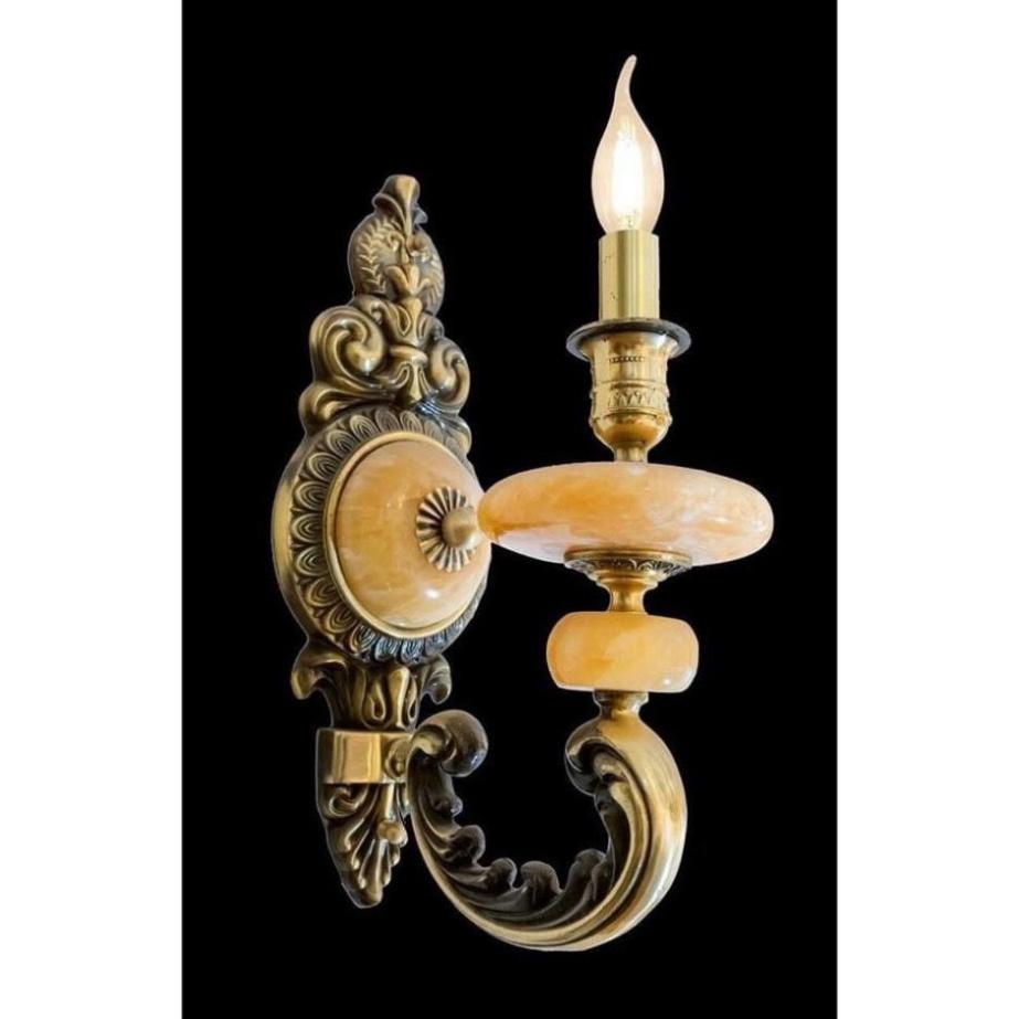 Chất liệu: Thân tay đèn và đế gắn tường là đồng thuần chất đúc tinh vi theo kiểu tân cổ điển; đế đèn điện là đá sa thạch nguyên khối được đúc gọt tinh sảo, cứng cáp tạo ra sự vương quyền và vững chắc của đèn.