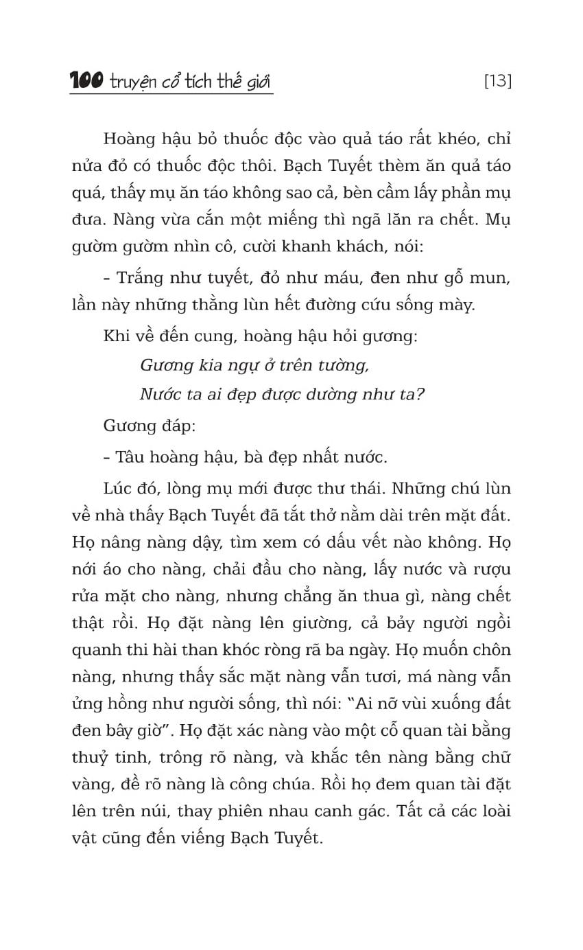 100 truyện cổ tích thế giới là tuyển tập những câu chuyện cổ tích hay nhất từ rất nhiều quốc gia trên thế giới. Cuốn sách sẽ dẫn các em bước vào một thế giới đầy màu sắc lung linh và diệu kỳ với nàng Bạch Tuyết, bảy chú lùn, cô bé lọ lem, với công chúa ngủ trong rừng, với những chàng hoàng tử, đến với những bữa tiệc, những bà tiê