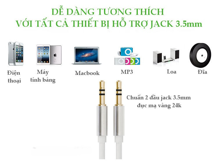 Mua tại TiktokMô tả sản phẩm Dây Audio 3.5mm tròn mạ vàng 24K, TPE cao cấp Giắc âm thanh dạng tròn chuẩn 2 đầu 3.5mm dùng để kết nối các thiết bị nghe nhạc như điện thoại, máy tính bảng, máy tính, laptop... đến loa, cùng bạn thưởng thức những giai điệu hay nhất Đầu kết nối được mạ vàng 24k cho chất lượng âm thanh cực tốt. Lõi cáp sử dụng đồng nguyên chất, cho tín hiệu âm thanh truyền qua trung thực, không suy hao. Với thiết kế TINH TẾ dạng dây dẹt và tròn, nhiều màu sắc cũng như độ dài mang lại sự lựa chọn hoàn hảo cho người dùng