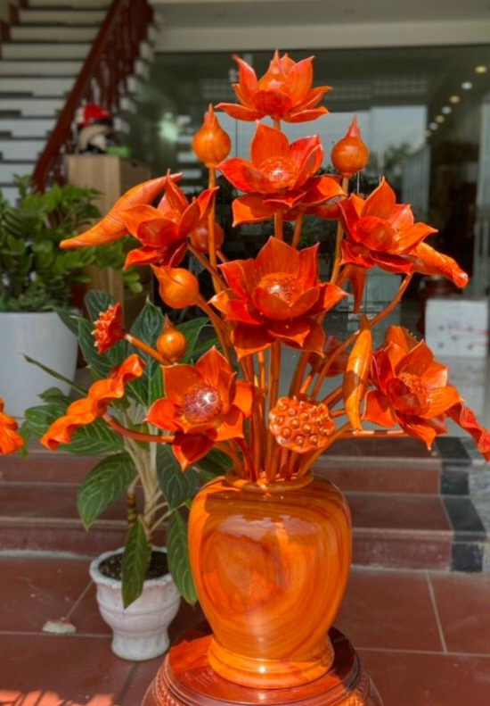 _ 1 bình hoa sen 21 cành trang trí ,phòng khách ,phòng thờ được làm bằng chất liệu gỗ hương đỏ tự nhiên 100% _ Kt bình cắm 23×22cm+ hoa lá gương cao tổng 85cm