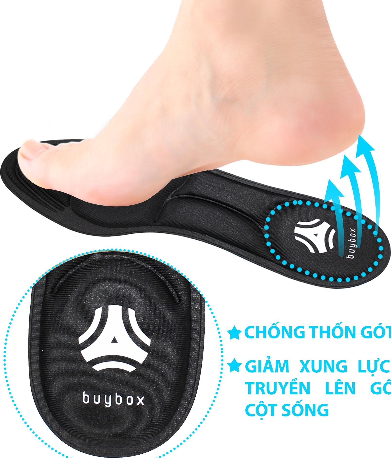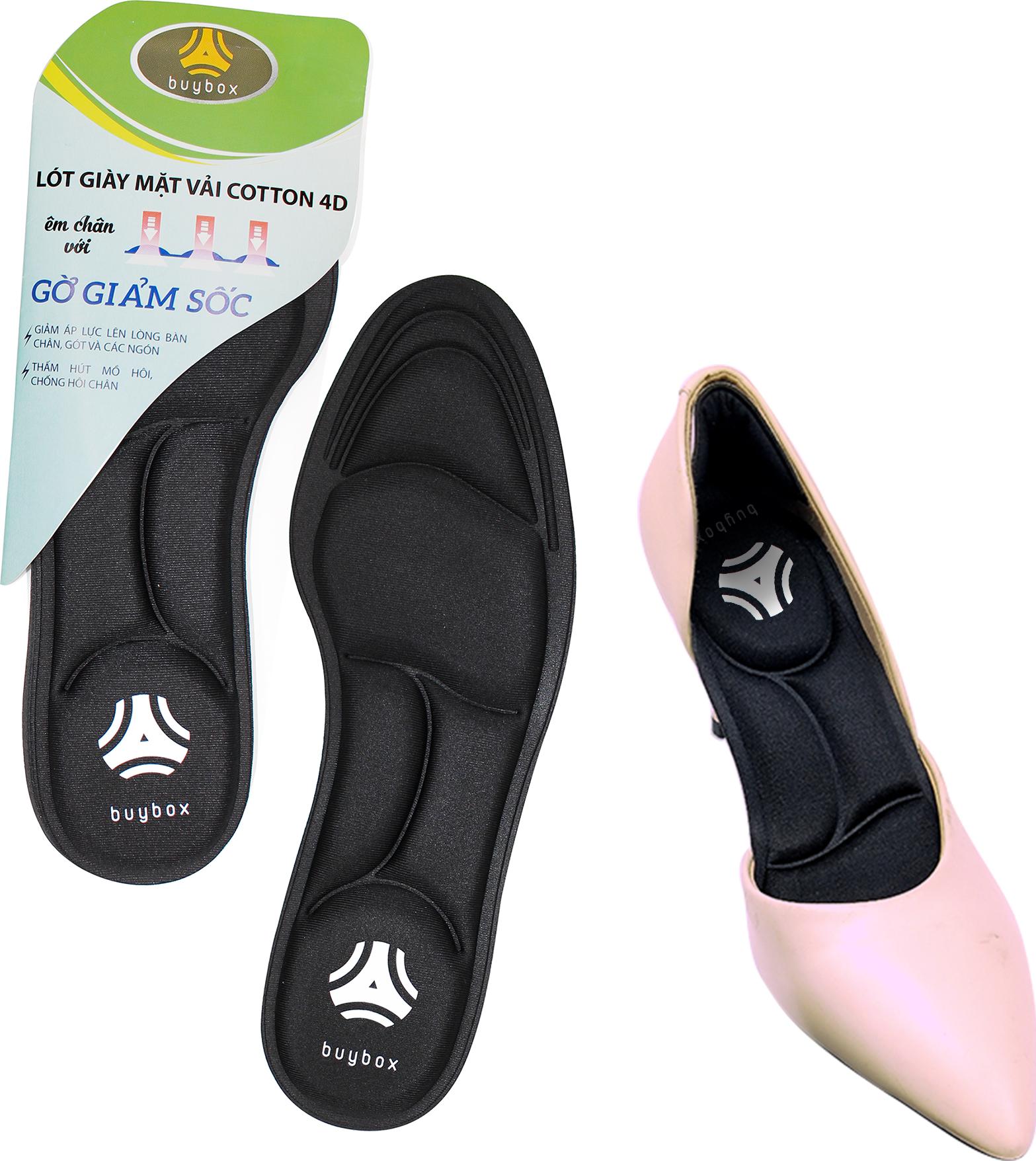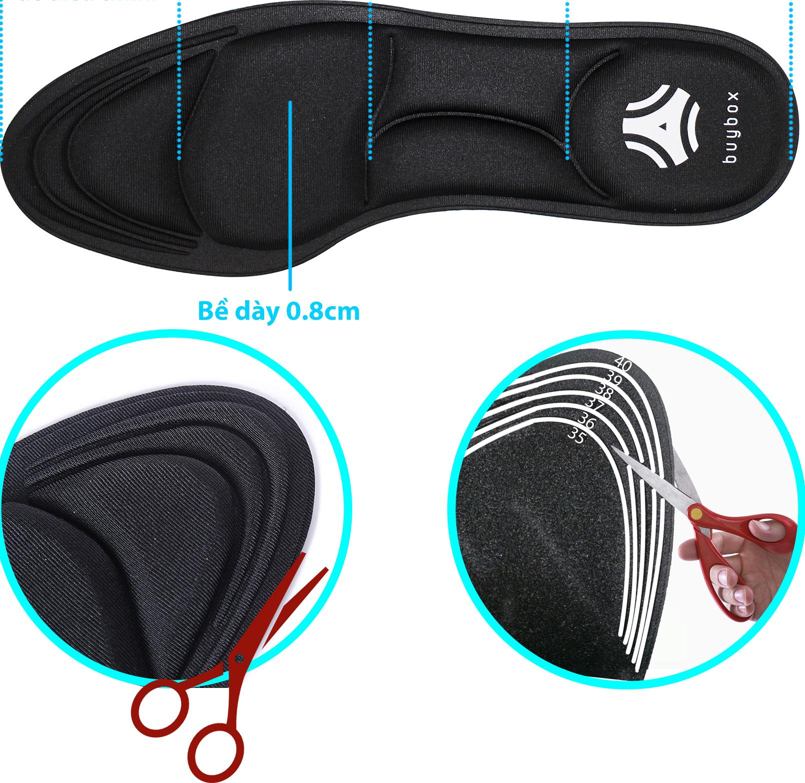 - Từ nay không còn phải lo lắng nữa vì đã có lót giày đa năng 4D buybox giúp êm chân và chống hôi chân CÔNG DỤNG NỔI BẬT Loại lót giày nguyên bàn chân, thiết kế 4D cực êm Sản phẩm có thể giặt sạch bằng xà phòng nhẹ và tái sử dụng nhiều lần, dễ tháo lấp Giày đi lâu ngày, phần lót giày bị lún, lót vào đi êm chân hơn, thoải mái. Sản phẩm thiết kế 4D, kết hợp 2 trong 1 vừa bảo vệ chân, chống được mồ hôi chân. Được làm từ chất liệu cao cấp rất êm chân, thoáng khí & bền bỉ. Mặt dưới miếng lót in các đường cong tương ứng các size 35 - 36 - 37 - 38 - 39 - 40. Dùng kéo cắt theo các đường cong này để có được kích thước cần sử dụng. Lót giày đa năng 4D sử dụng được cho nhiều loại giày khác nhau như: giày cao gót mũi nhọn, giày búp bê mũi nhọn, giày mọi, giày lười, giày thể NGỮ CẢNH SỬ DỤNG