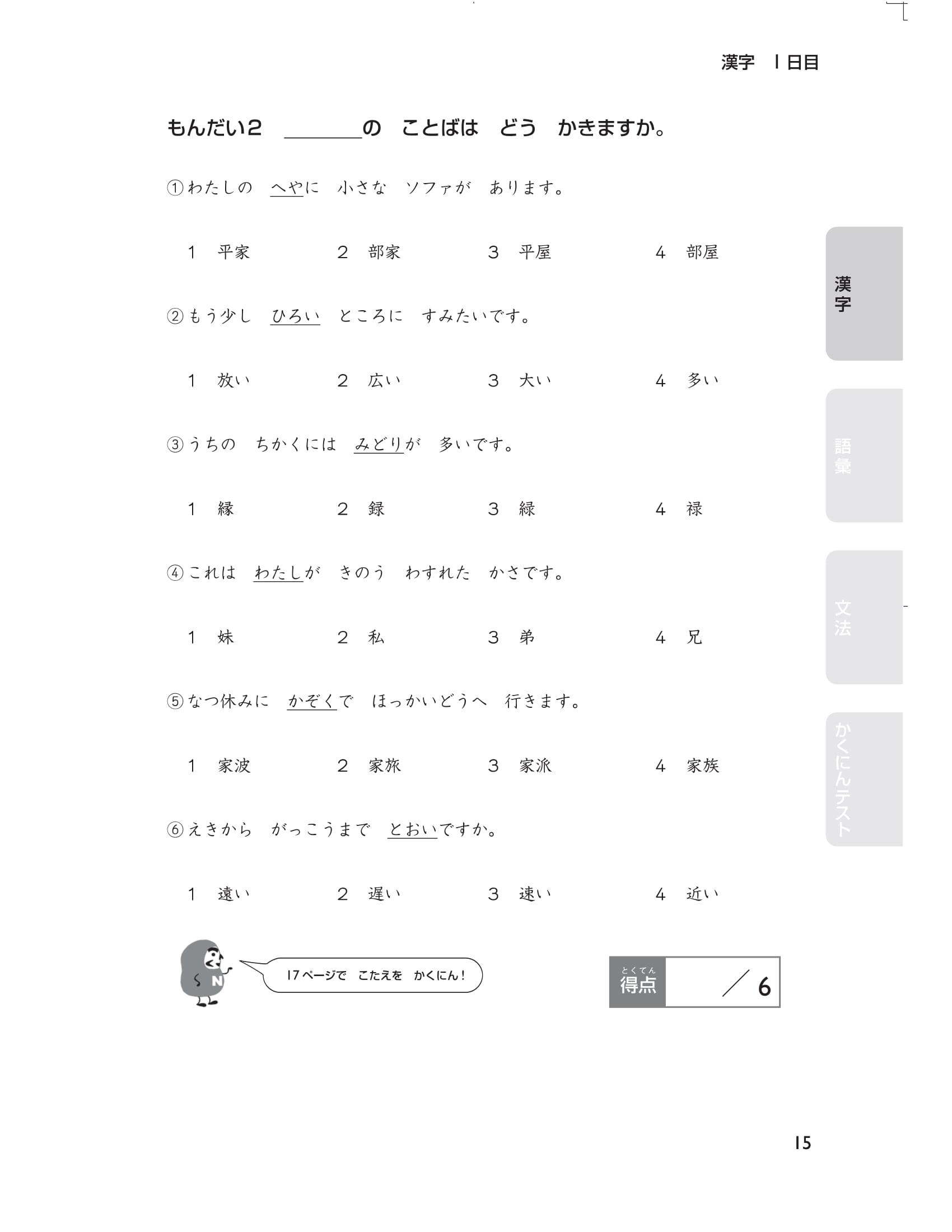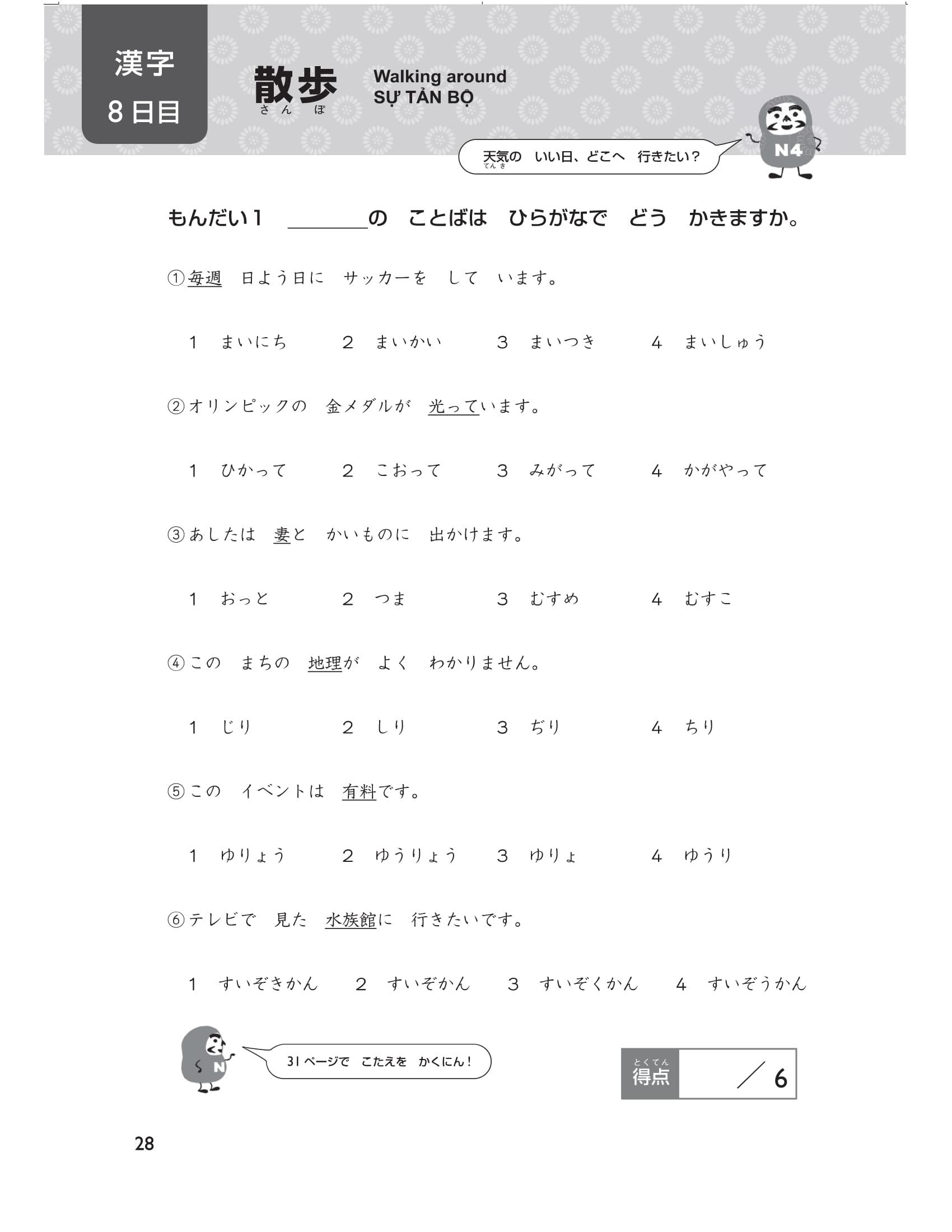 Cuối cùng, có 5 bài thi thử (tổng cộng 40 câu hỏi) mô phỏng đề thi năng lực tiếng Nhật. Thử thách bản thân ngay trước kỳ thi bằng cách xem lại nhiều lần những chỗ mình đã sai ( thứ tự các phần trong đề thi chính thức là chữ Hán, từ vựng và cuối cùng là ngữ pháp) bạn nhé. Hãy sử dụng cuốn sách này một cách hiệu quả Chúng tôi đã chuẩn bị rất nhiều câu hỏi để các bạn có thể luyện tập trong 15 ngày theo thứ tự các phần: chữ Hán, từ vựng, ngữ pháp. Hơn nữa, thông qua bảng checklist bạn có thể dễ dàng phân bổ số lượng câu hỏi nên làm trong một ngày và sắp xếp kế hoạch học tập cho đến thời điểm thi sao cho phù hợp.