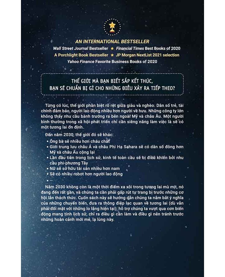Năm 2030, không còn là một thời điểm xa xôi trong tương lai mù mịt, nó đang đến rất gần, và chúng ta cần phải gấp rút tự trang bị trước những cơ hội lẫn thách thức. Cuốn sách này sẽ hướng dẫn chúng ta nắm bắt ý nghĩa của những chuyển biến, đưa ra thông điệp lạc quan về tương lai (dù vẫn phải đối mặt với những lo lắng hiện tại); hỗ trợ chúng ta vượt qua cơn biến động mang tính lịch sử, chỉ ra điều gì cần làm và điều gì nên tránh trước những hoàn cảnh mới mẻ, lạ lùng này.
