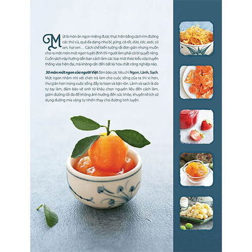 30 Món Mứt Ngon Của Người Việt đảm bảo các tiêu chí Ngon, Lành và Sạch. Mứt ngon nhâm nhi với chén trà làm cuộc sống của chúng ta thi vị hơn, thư giãn hơn trong cuộc sống đầy lo toan và bận rộn. Lành và sạch là do tự tay làm, đảm bảo vệ sinh từ khâu chọn nguyên liệu đến cách làm, giảm đường tối đa để không ảnh hưởng đến sức khỏe, khuyến khích sử dụng đường mía vàng tự nhiên thay cho đường tinh luyện.