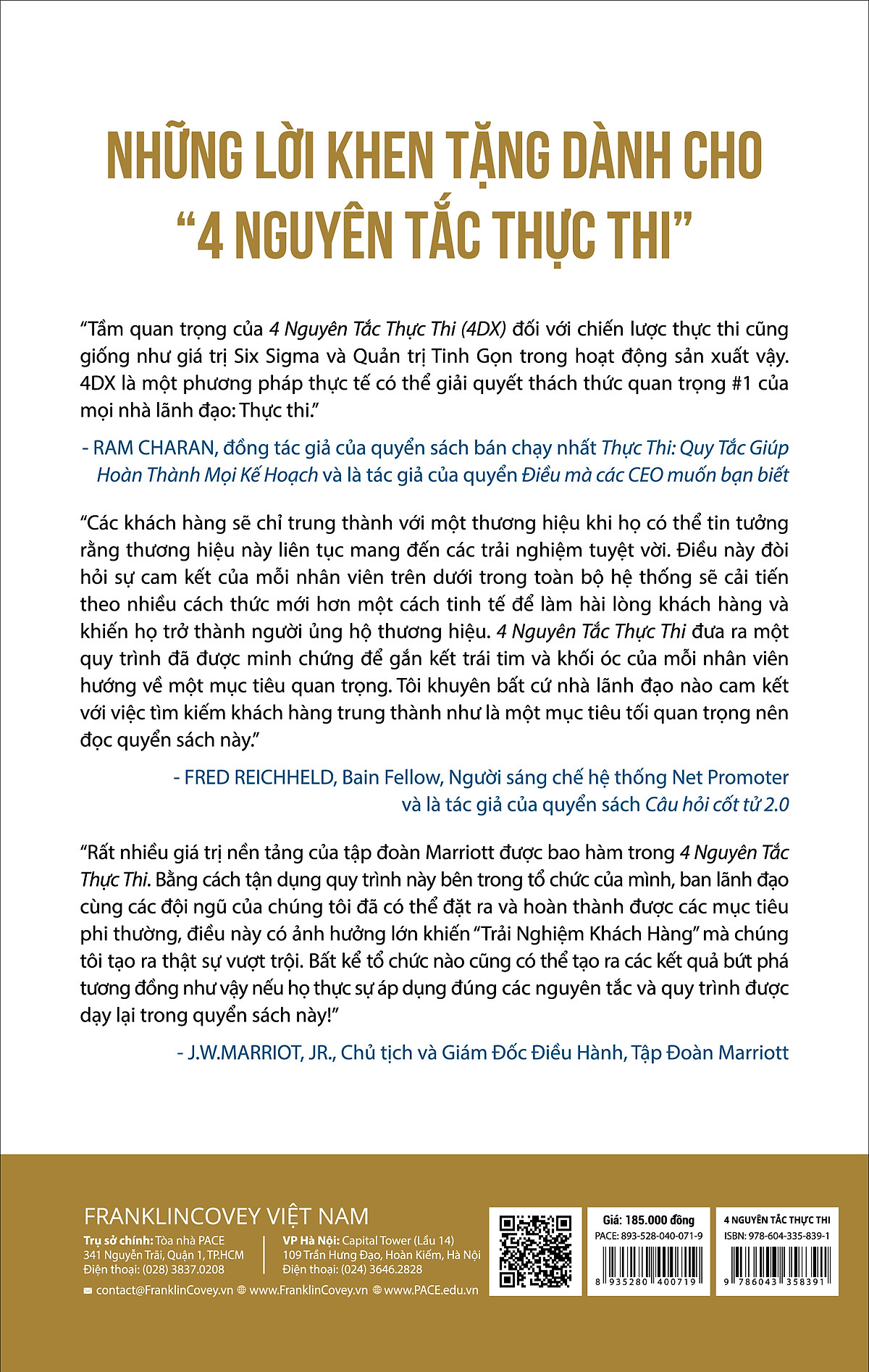 Tiến sỹ Stephen R. Covey, tác giả cuốn sách bán chạy nhất 7 Thói Quen Hiệu Quả đã đưa ra nhận xét về quyển 4 Nguyên Tắc Thực Thi như sau: “Trong thời đại công nghiệp đầy những kỹ thuật quản trị kiểu áp đặt từ trên xuống và mang tính kiểm soát, 4 Nguyên tắc này đã đưa ra một cách tiếp cận của thời đại kinh tế tri thức cho câu chuyện thực hiện các mục tiêu và chiến lược; một cách tiếp cận theo hướng giải phóng, lôi kéo được trái tim và tâm trí của con người cùng hướng đến một mục tiêu chung mà tôi chưa từng thấy trước đây. Đây thật sự là một công trình sâu sắc!”