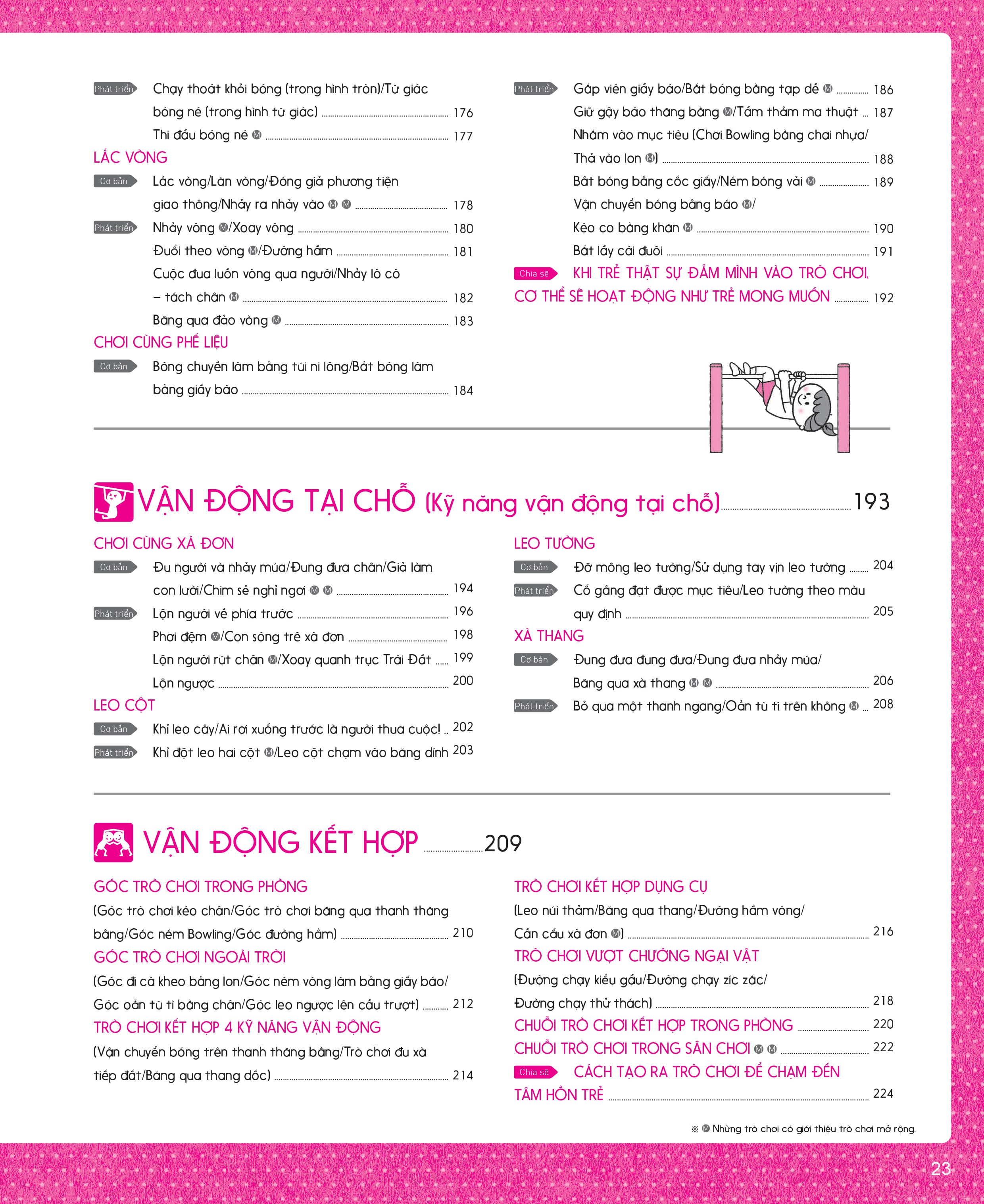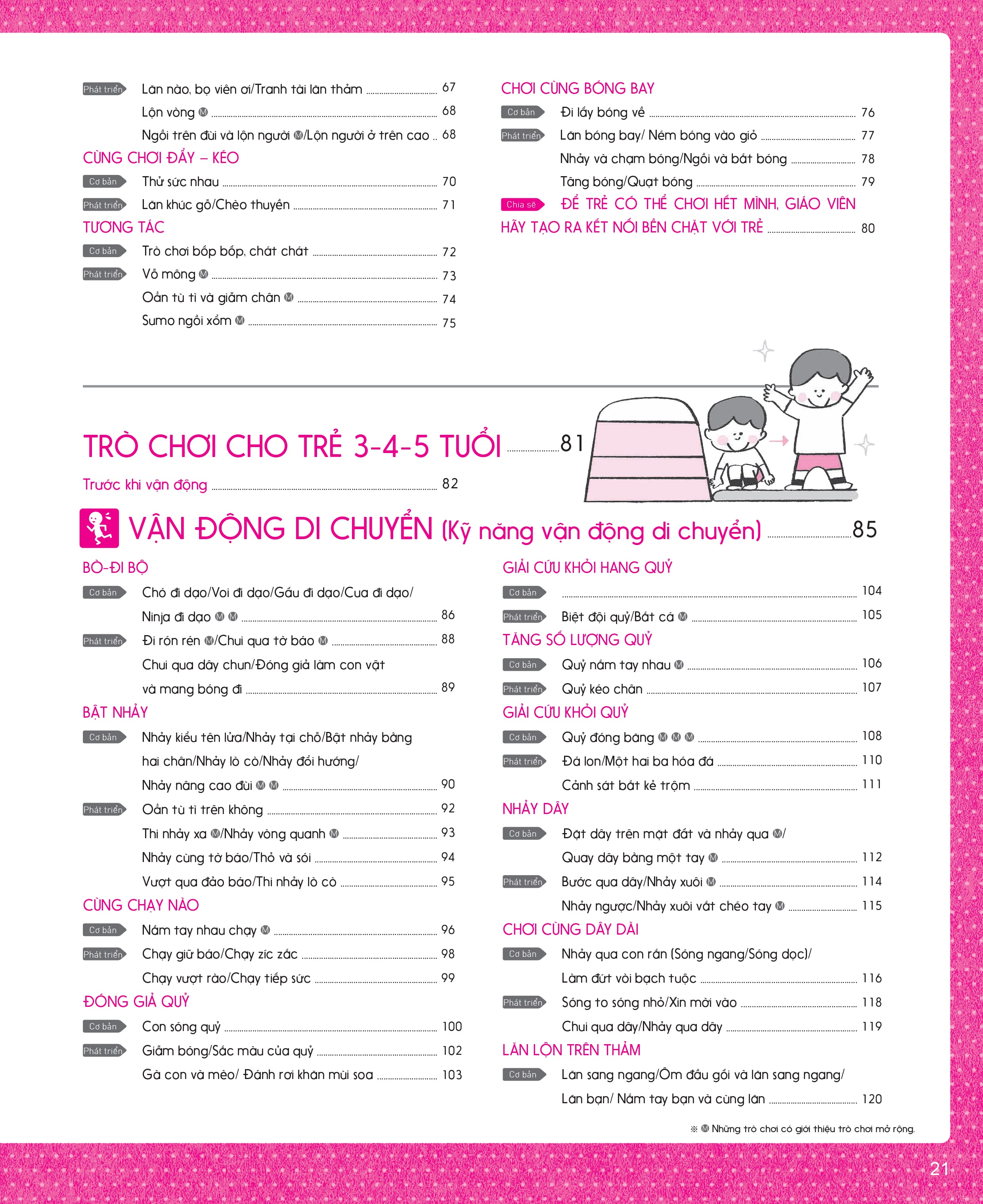 Với phần trình bày chi tiết và minh họa rõ ràng, cuốn sách sẽ giúp phụ huynh và giáo viên có những phút giây vui chơi, tương tác, giao tiếp với trẻ một cách vui vẻ, an toàn và hiệu quả. Hãy cùng trẻ tận hưởng những trò chơi vận động này nhé!