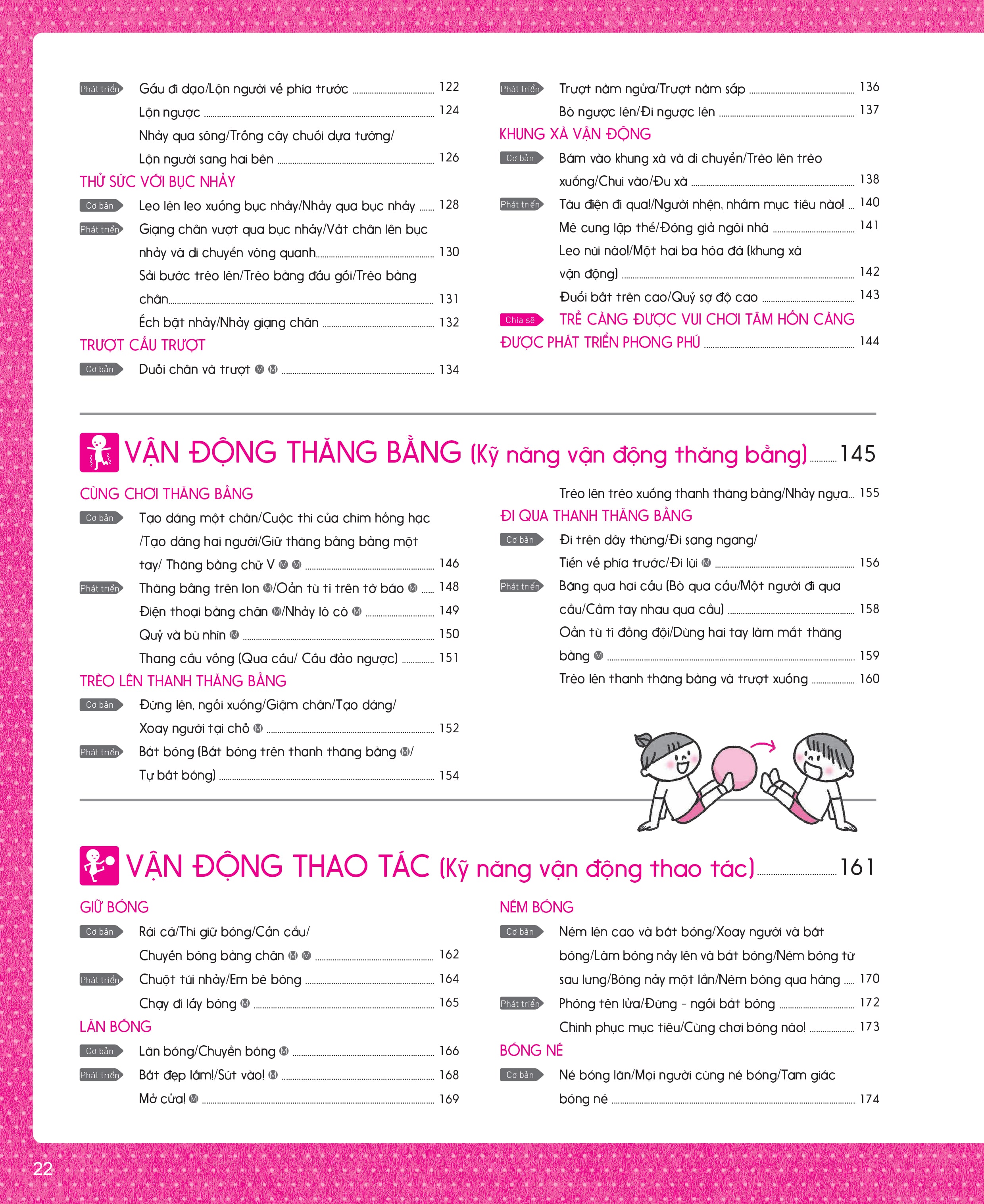GIỚI THIỆU NỘI DUNG 5 năm đầu đời là giai đoạn quan trọng đối với sự phát triển của trẻ. Để giúp con trẻ phát triển toàn diện, cha mẹ và giáo viên cần cho trẻ tham gia nhiều hoạt động thể lực và các trò chơi vận động đa dạng ngay từ giai đoạn mầm non. Các trò chơi vận động không chỉ đem đến cho trẻ những khoảng thời gian vui vẻ và nuôi dưỡng niềm yêu thích vận động ở trẻ, mà còn góp phần giúp trẻ nâng cao sức khỏe và sức đề kháng, sự linh hoạt của cơ thể. Đồng thời, trẻ còn được bồi đắp cảm xúc, các kỹ năng xã hội và trí thông minh trong quá trình vui chơi. Có thể nói, nền tảng cơ bản của tất cả các năng lực mà trẻ cần để tồn tại sẽ được hình thành một cách hiệu quả và tự nhiên nhất thông qua việc tham gia các trò chơi vận động. Tựa sách “450 trò chơi vận động cho trẻ mầm non” giới thiệu nhiều trò chơi đa dạng để trẻ có thể chơi quanh năm ngay từ thời kỳ sơ sinh. Những trò chơi này có thể kết hợp dễ dàng với việc chăm sóc trẻ, giúp trẻ làm quen với việc vận động và các bài tập thể dục ngay từ sớm. Các hoạt động và trò chơi được phân loại dựa theo bốn kĩ năng vận động chính: di chuyển, thăng bằng, thao tác, tại chỗ, có nhiều cấp độ để tăng sự hứng thú và tăng lượng vận động của trẻ, nhờ vậy giáo viên và phụ huynh có thể dễ dàng lựa chọn hoạt động phù hợp với độ tuổi và giai đoạn phát triển của trẻ.