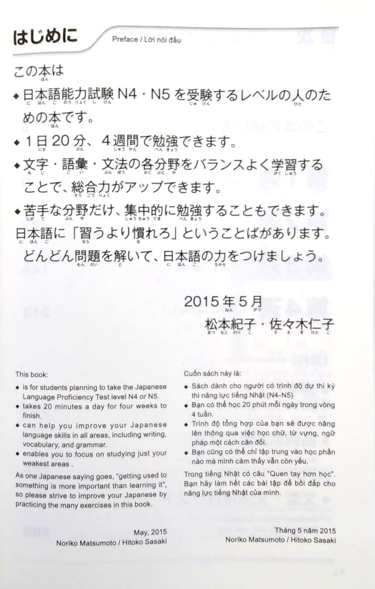 Điểm đặc biệt là sách được thiết kế theo ngày, mỗi ngày người học có thể ôn cả 3 kỹ năng : Từ vựng, Ngữ pháp, Hán tự chỉ với 15 phút. · Khổ sách