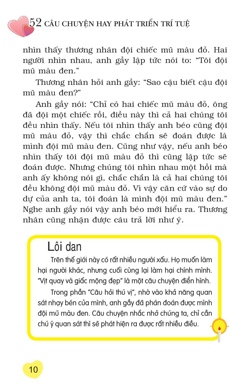 Mua tại Tiktok“52 câu chuyện hay phát triển trí tuệ” gồm 52 câu chuyện hay, đặc sắc dành cho 52 tuần lễ trong năm. Mỗi tuần, ngoài một câu chuyện chính, còn có các chuyên mục phụ khác với nội dung liên quan như: Lời dẫn, Câu chuyện bên lề, Vệ sĩ trái đất, Nhà văn nhỏ tuổi, Kho trí tuệ…, giúp trẻ mở rộng kiến thức, gợi sự say mê đọc sách. Ngoài ra, chuyên mục “Câu đố” sẽ tạo hứng thú cho trẻ suy nghĩ để tìm ra một cách nhanh nhất, đúng nhất đáp án.