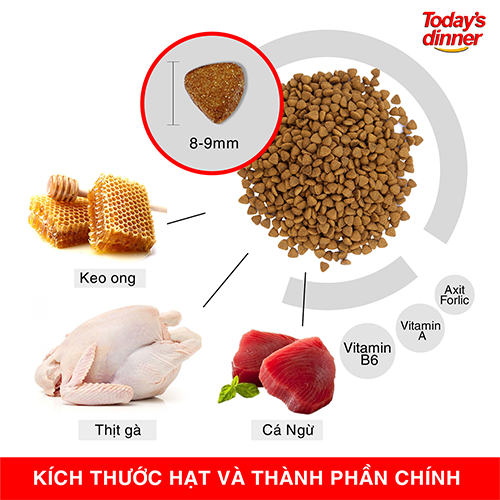 THỨC ĂN HẠT CHO MÈO MỌI LỨA TUỔI TODAY'S DINNER 1KG THÔNG TIN SẢN PHẨM THÀNH PHẦN Loại sản phẩm: Thức ăn hỗn hợp hoàn chỉnh cho mèo Tên sản phẩm: Today’s dinner Nhà sản