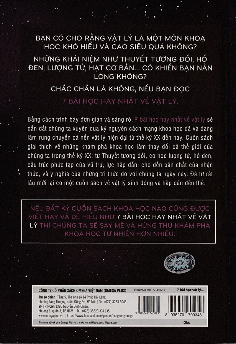 "Bằng cách trình bày đơn giản và sáng rõ, Bảy bài học hay nhất về vật lý sẽ dẫn dắt chúng ta xuyên qua kỷ nguyên cách mạng khoa học đã và đang làm rung chuyển cả nền vật lý hiện đại từ thế kỷ XX đến nay. Cuốn sách giải thích về những khám phá khoa học làm thay đổi cả thế giới của chúng ta trong thế kỷ XX: từ thuyết tương đối, cơ học lượng tử, hố đen, cấu trúc phức tạp của vũ trụ, lực hấp dẫn, cho đến bản chất của nhận thức, và ý nghĩa của những tri thức đó với chúng ta ngày nay. Đã từ rất lâu mới lại có một cuốn sách về vật lý sinh động và hấp dẫn đến thế. "