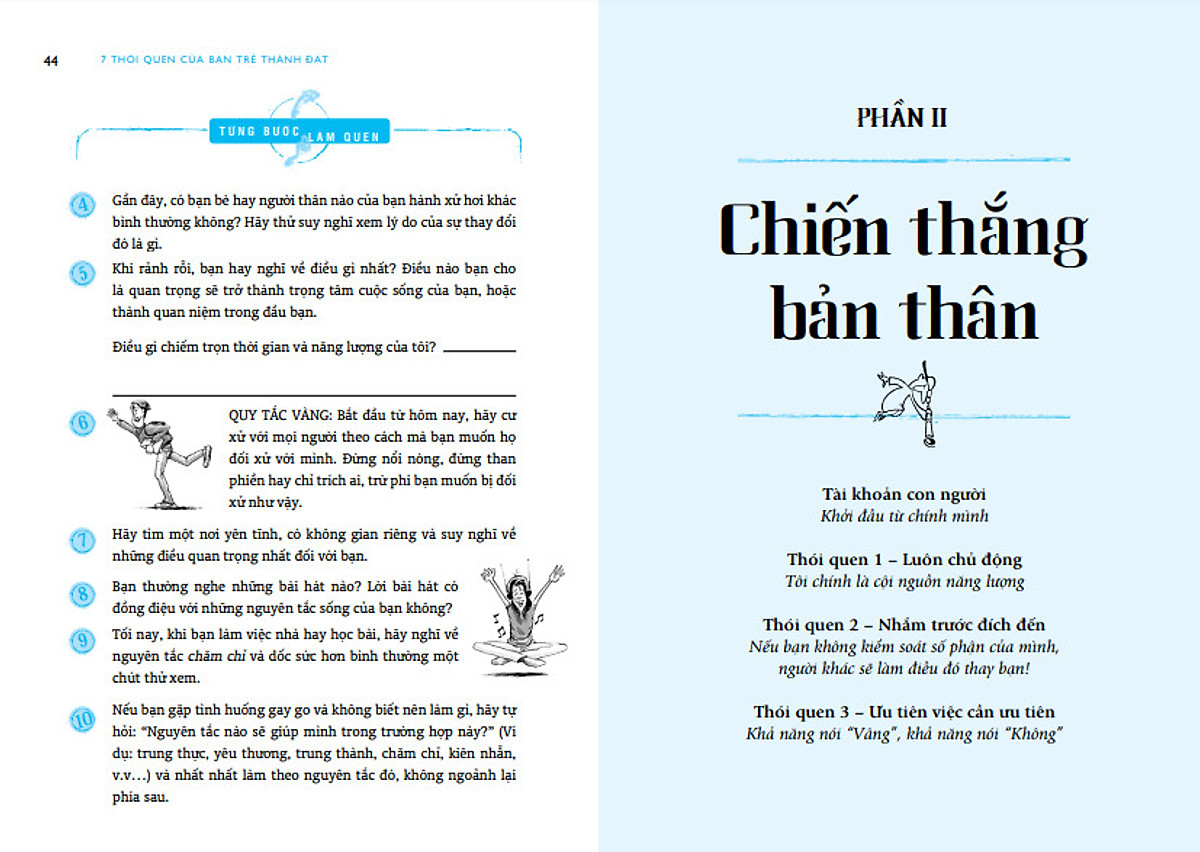 Tuổi thiếu niên và trưởng thành là tuổi đẹp nhất và quan trọng nhất của đời người. Đây cũng là lứa tuổi mà các bạn trẻ bắt đầu khám phá cuộc sống với những ước mơ, khát vọng. Phía trước các bạn là những con đường bằng phẳng, êm ái; nhưng cũng có con đường quanh co, khúc khuỷu. Có con đường ngập tràn ánh sáng, cũng có con đường u ám, đầy cạm bẫy, nguy cơ. Nhưng làm cách nào để chọn được con đường đến đích thành công, hạnh phúc mà không lãng phí nhiều thời gian, công sức? Tất cả đều phụ thuộc vào tính cách và thói quen của các bạn. Có những thói quen đem đến sự thành công, hạnh phúc; nhưng cũng có những thói quen cản trở, phá hỏng sự phát triển của bạn.