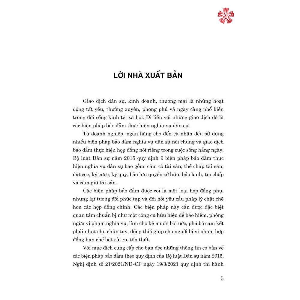 Với mục đích cung cấp cho bạn đọc những thông tin cơ bản về các biện pháp bảo đảm theo quy định của Bộ luật Dân sự năm 2015, Nghị định số 21/2021/NĐ-CP ngày 19/3/2021 quy định thi hành Bộ luật Dân sự về bảo đảm thực hiện nghĩa vụ, Nhà xuất bản Chính trị quốc gia Sự thật tái bản có sửa chữa, bổ sung cuốn sách: 9 biện pháp bảo đảm nghĩa vụ hợp đồng (Quy định, thực tế và thiết kế giao dịch theo Bộ luật Dân sự hiện hành) do Luật sư Trương Thanh Đức, Giám đốc Công ty Luật ANVI, Trọng tài viên Trung tâm trọng tài quốc tế Việt Nam (VIAC), thành viên Nhóm chuyên gia tư vấn xây dựng và thành viên Hội đồng thẩm định Dự án Bộ luật Dân sự biên soạn. Tác giả đã có hơn 30 năm nghiên cứu, trải nghiệm thực tiễn và hơn 40 bài viết chuyên sâu về giao dịch bảo đảm, đặc biệt là bảo đảm tiền vay của các ngân hàng thương mại. Trong cuốn sách này, tác giả đã phân tích, luận giải các biện pháp bảo đảm cả về quy định pháp lý và khả năng áp dụng trên thực tiễn, đồng thời gợi mở cách thức thực hiện cho các chủ thể tham gia giao dịch này.