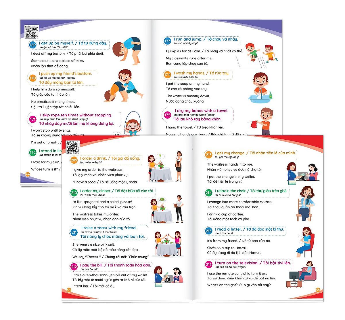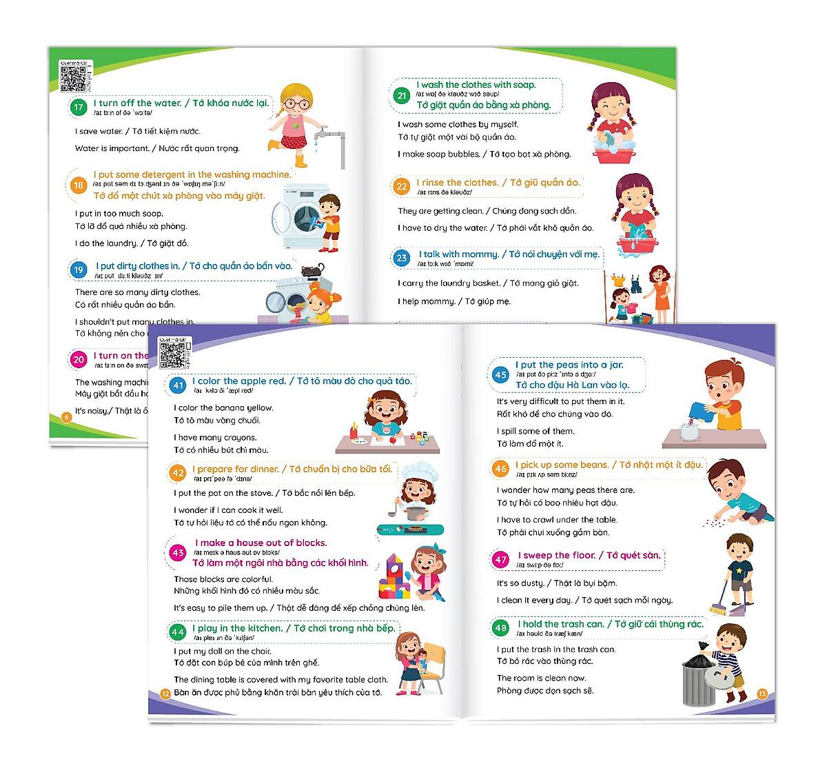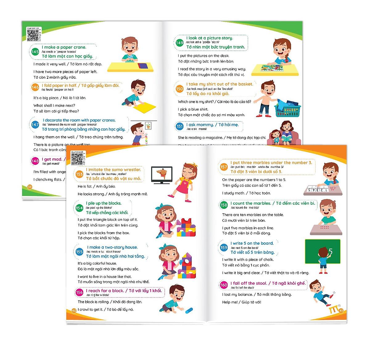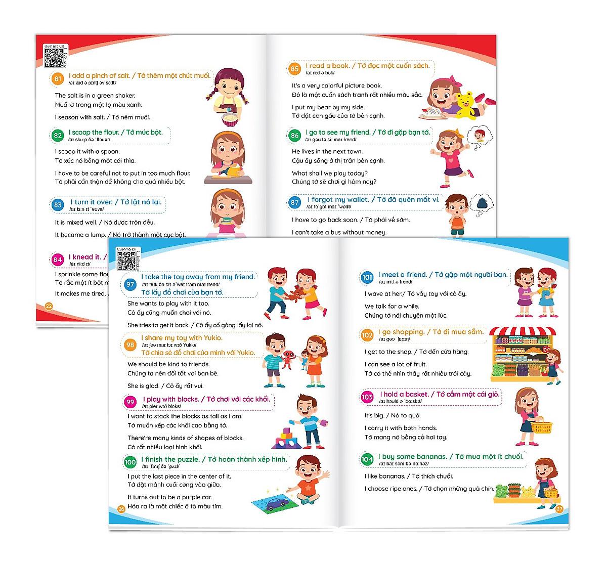 Mua tại Tiktok900 câu giao tiếp tiếng Anh thường dùng hằng ngày Cẩm nang cho mẹ cùng con học tiếng anh mỗi ngày (song ngữ Anh – Việt) File nghe Quét mã QR Cuốn sách gồm 900 câu đàm thoại tiếng Anh để cha mẹ cùng con có thể giao tiếp về các chủ đề xung quanh cuộc sống hằng ngày, từ lúc thức dậy vào buổi sáng, đi học, đi chơi, đi siêu thị … cho đến lúc đi ngủ. Có cuốn sách này thì cha mẹ không lo bí từ, không biết nói tiếng Anh như thế nào cùng con. Đây là cuốn cẩm nang giúp cho cha mẹ có cơ hội học tập và giao tiếp tiếng Anh cùng con, để cả hai cùng tiến bộ mỗi ngày. Thông tin sách: 80 trang, khổ 20.5 x 25 cm, tác giả: Alice Beatrice, NXB Hà Nội Giá bìa: 110.000đ