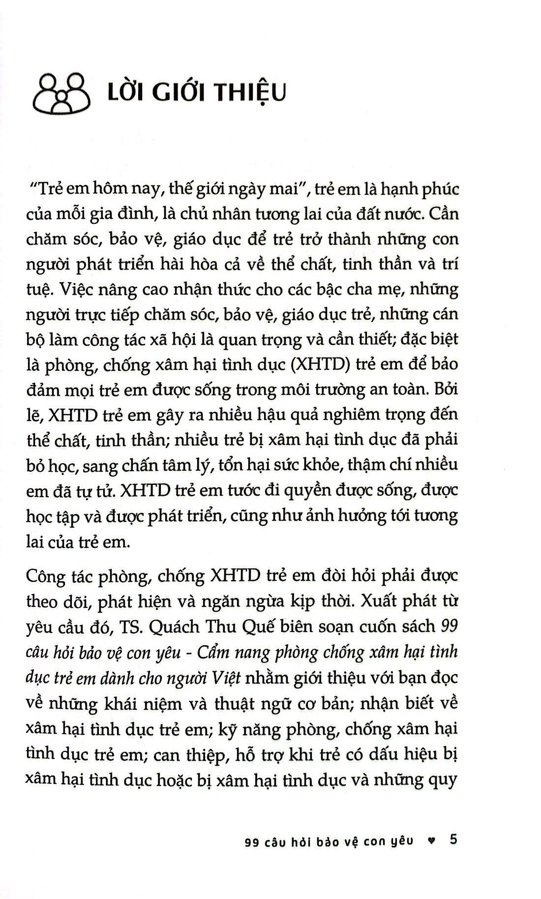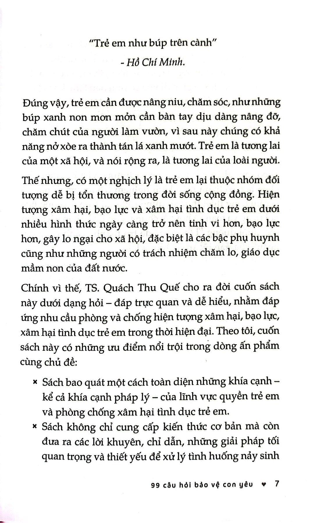 Chính vì thế, TS. Quách Thu Quế cho ra đời cuốn sách này dưới dạng hỏi – đáp trực quan và dễ hiểu, nhằm đáp ứng nhu cầu phòng và chống hiện tượng xâm hại, bạo lực, xâm hại tình dục trẻ em trong thời hiện đại. "