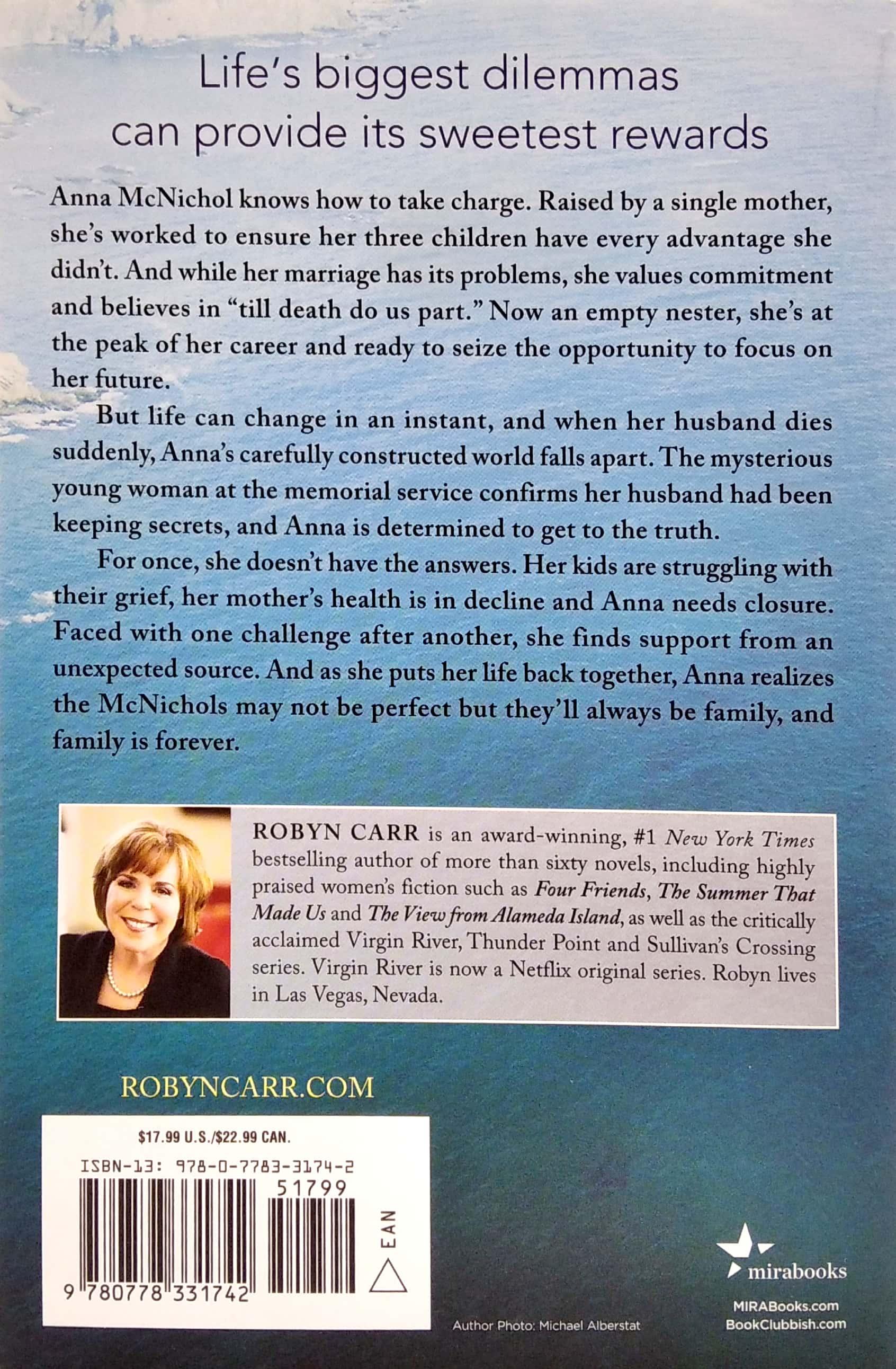 For once, she doesn’t have the answers. Her kids are struggling with their grief, her mother’s health is in decline and Anna needs closure. Faced with one challenge after another, she finds support from an unexpected source. And as she puts her life back together, Anna realizes the McNichols may not be perfect but they’ll always be family, and family is forever.