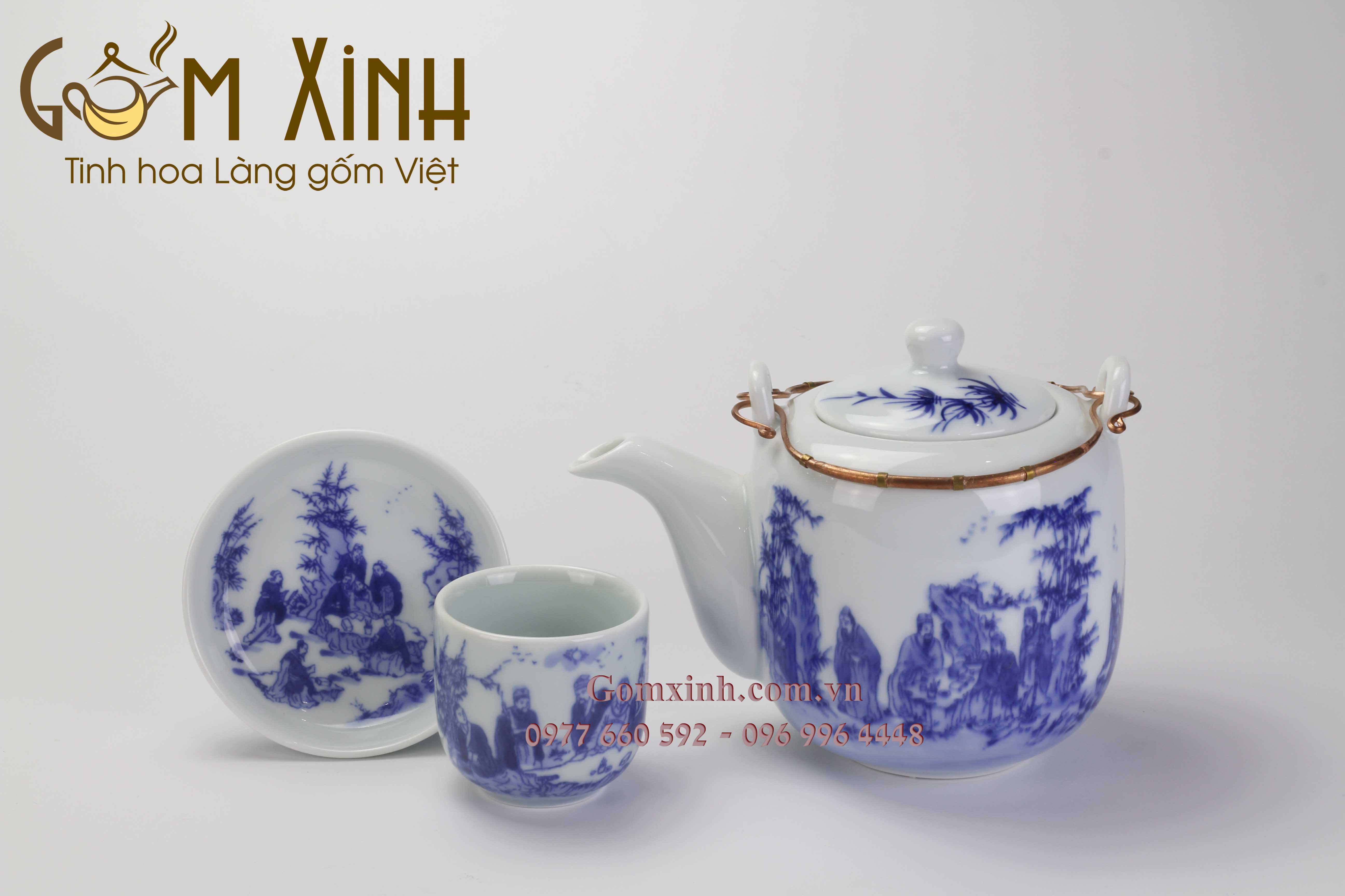 Bộ ấm chén men lam cổ Bát Tràng vẽ Trúc lâm thất hiền được làm thủ công tại làng nghề Bát Tràng.