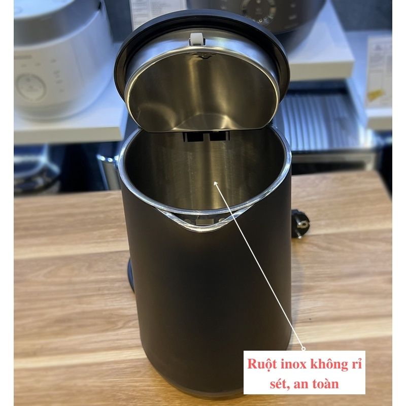 Dung tích: 1.7L Công suất: 1800W Ưu điểm nổi bật: 2 lớp cách nhiệt: Thép không gỉ bên trong, nhựa mát tay bên ngoài – an toàn tuyệt đối, nhất là với gia đình có