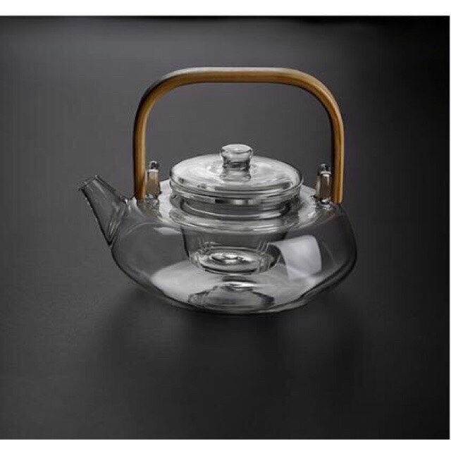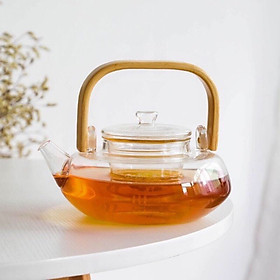 ấm pha trà thủy tinh có quai xách và nắp gỗ, lõi lọc trà Ấm chịu nhiệt nấu được trên bếp điện và bế