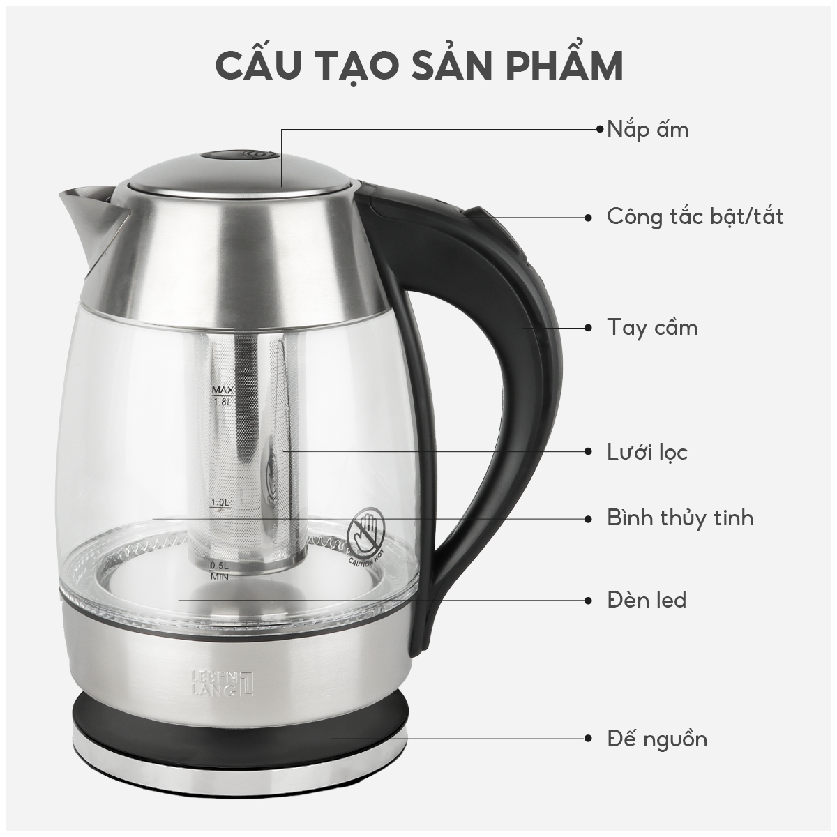 Ấm siêu tốc, bình thủy tinh Lebenlang LBLB2226 có lõi lọc trà, 2200W, 1800ml, bảo hành 2 năm - hàng chính hãng 10 LÝ DO NÊN CHỌN ẤM SIÊU TỐC LBLB2226 CỦA LEBENLANG -   Đế Xoay 360 Độ-   Miệng R...