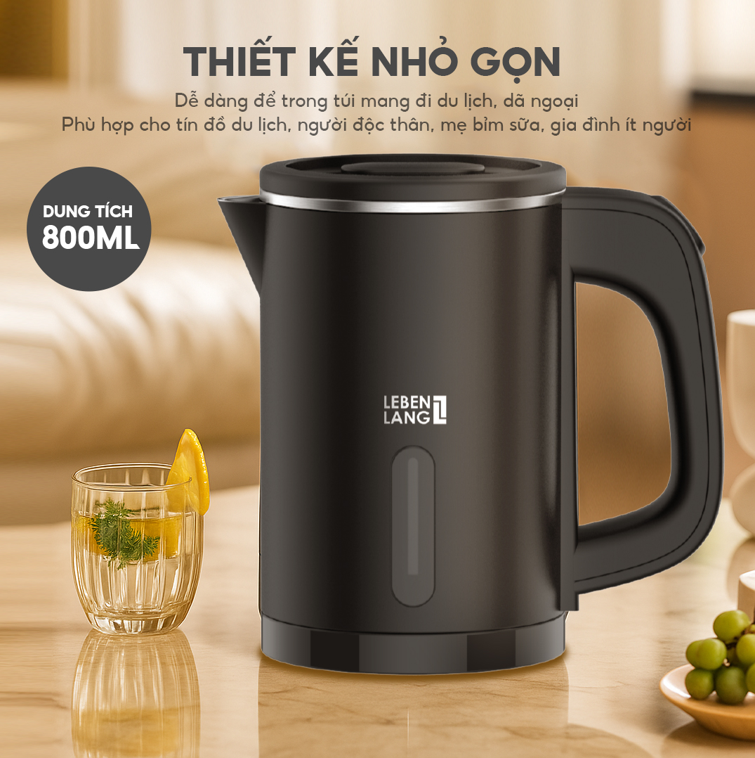✨Ấm Siêu Tốc Mini Lebenlang LBL2318, 800ml, Inox, Công Suất 1000W, Tự Ngắt, Đèn Báo, Nhỏ Gọn - Hàng chính hãng
