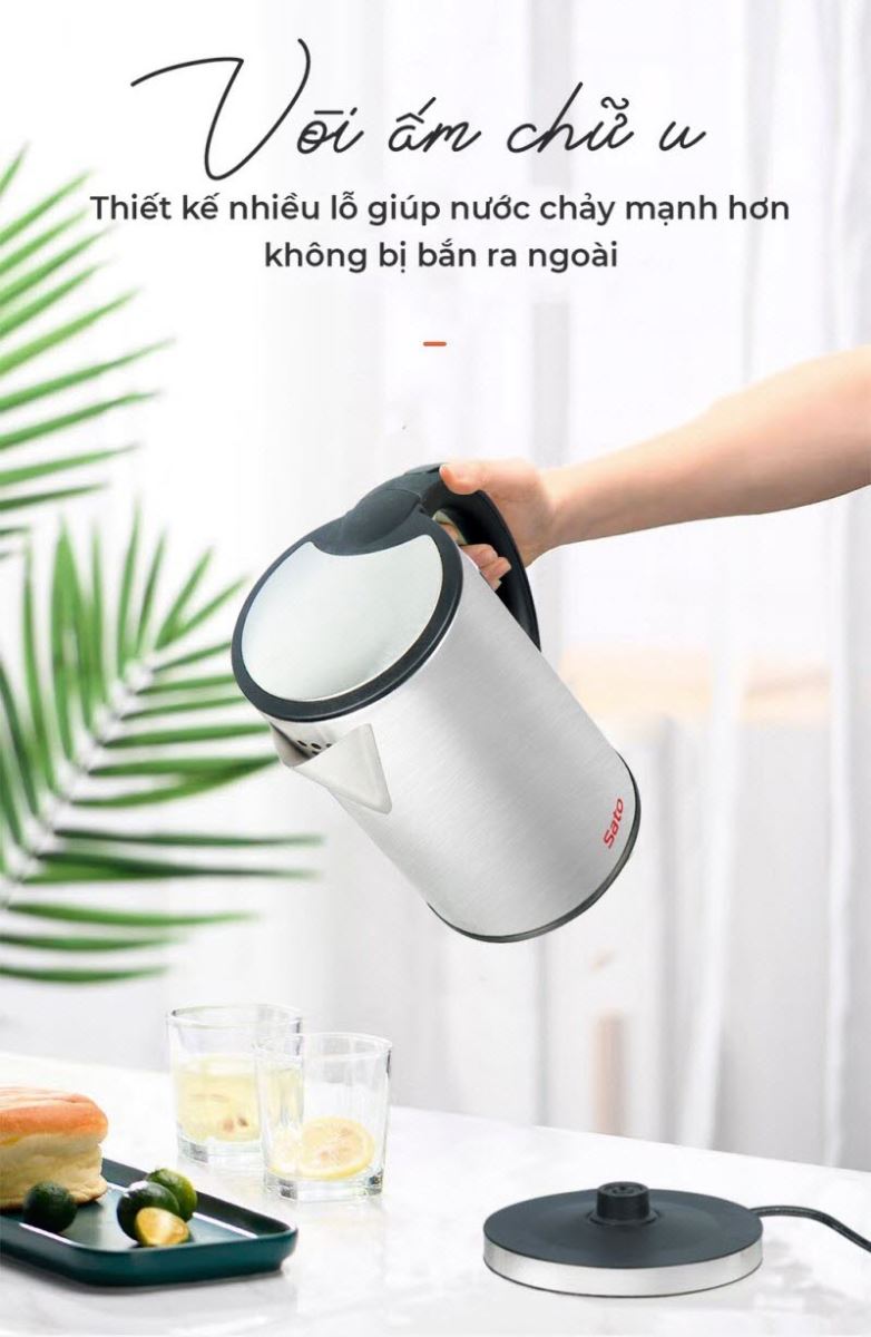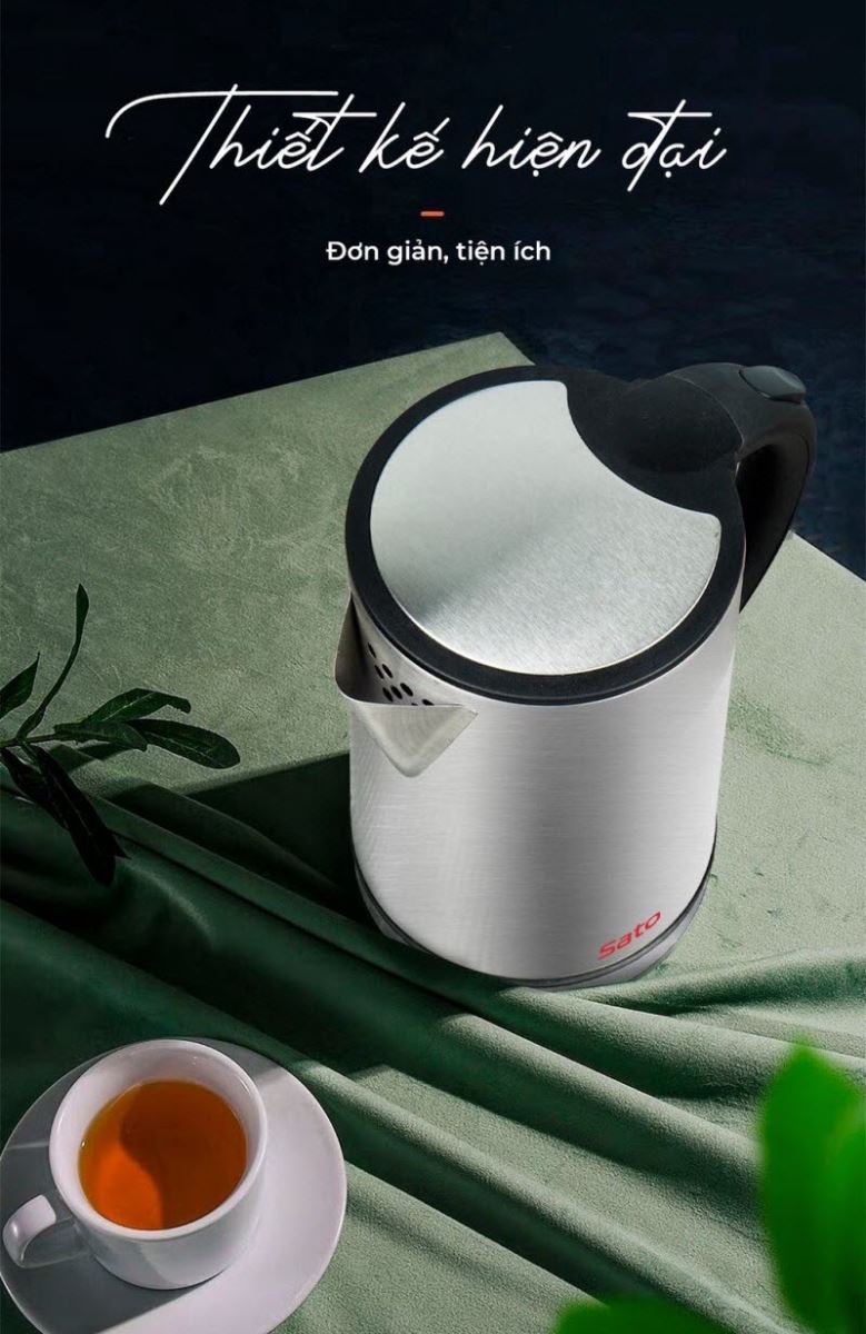 Mua tại TiktokĐặc điểm nổi bật Thân ấm bằng inox cao cấp không gỉ, an toàn sử dụng. Dung tích 1.8L, đế xoay 360 độ tiện dụng. Công suất 1500W đun sôi nước nhanh chóng. Tự động ngắt điện khi nước sôi hoặc khi ấm cạn nước. Công nghệ Nhật Bản - Sản xuất tại Việt Nam! Sản phẩm chính hãng Sato - Bảo hành 1 năm - Yên tâm sử dụng cùng #Sato !