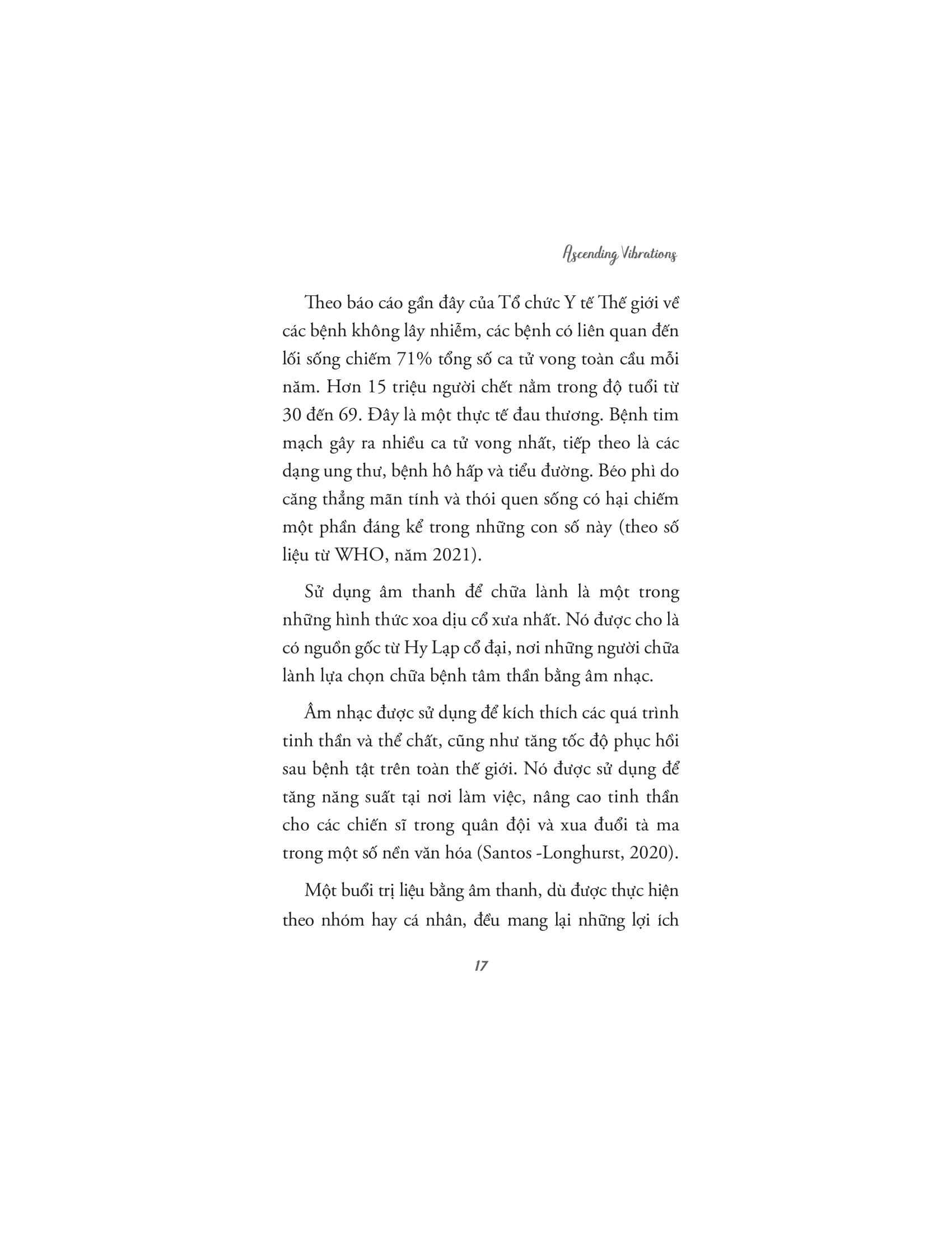 Âm Thanh Chữa Lành Thân Tâm Với nhịp sống hối hả hiện nay, mức độ căng thẳng ngày càng tăng khiến cơ thể và tâm trí bạn mệt mỏi. Âm nhạc và phương pháp trị liệu bằng âm thanh trở thành một trong số những phương pháp then chốt trong việc đ.iều trị tâm lý. Một trong những tác động đáng chú ý nhất của âm thanh và âm nhạc là khả năng ảnh hưởng đến tâm trạng. Một số âm thanh hoặc bản nhạc có thể khơi gợi những cảm xúc cụ thể như hạnh phúc, nỗi buồn hoặc nỗi nhớ. Ví dụ, nghe nhạc sôi động và lạc quan có thể tăng mức năng lượng, nâng cao cảm xúc tích cực và thúc đẩy cảm giác vui vẻ, nhiệt tình. Ngược lại, những giai điệu nhẹ nhàng, du dương có thể tạo bầu không khí yên tĩnh giúp chúng ta thư giãn, giảm căng thẳng. Cuốn sách "Âm Thanh Chữa Lành Thân Tâm" sẽ giúp bạn khai mở về sức mạnh của âm thanh trong việc chữa lành cả cơ thể lẫn tâm hồn. Cuốn sách tập trung vào việc giải thích cách mà âm thanh và các rung động có thể ảnh hưởng đến trạng thái năng lượng của con người, giúp xoa dịu căng thẳng, tái tạo năng lượng và kích hoạt các quá trình chữa lành tự nhiên từ bên trong. Tác giả dẫn dắt người đọc qua những ứng dụng khoa học, tâm linh và siêu hình của âm thanh, giải thích cách mà các liệu pháp âm thanh cổ xưa đã được sử dụng trong nhiều nền văn hóa khác nhau để chữa lành và cải thiện sức khỏe. Âm thanh không chỉ có khả năng tác động đến cảm xúc, mà còn có thể ảnh hưởng tích cực đến hệ thần kinh, hệ miễn dịch, và thậm chí là các luân xa, trung tâm năng lượng trong cơ thể con người. Với nhiều kỹ thuật và phương pháp trị liệu âm thanh khác nhau, những liệu pháp này giúp cơ thể thư giãn, giảm căng thẳng, loại bỏ tắc nghẽn năng lượng và khôi phục lại trạng thái cân bằng tự nhiên. Một trong những thông điệp quan trọng của cuốn sách là sự kết nối sâu sắc giữa con người và vũ trụ thông qua âm thanh. Các rung động âm thanh không chỉ giúp giải phóng những cảm xúc bị kìm nén, mà còn mở ra những con đường năng lượng, giúp con người tiếp cận những tần số cao hơn, mang lại sự bình an và nhận thức sâu sắc về sự hiện diện và vai trò của m.ình trong vũ trụ. "Âm thanh chữa lành thân tâm" là một cuốn sách không chỉ dành cho những người muốn tìm hiểu về âm nhạc và trị liệu, mà còn cho bất kỳ ai mong muốn khám phá sự kết nối giữa thân, tâm và vũ trụ thông qua các rung động của âm thanh. Về Tác giả: Ascending Vibrations là một nhóm xuất bản độc lập dành riêng cho những ai muốn mở rộng ý thức và nâng cao sự tồn tại của họ. Họ muốn mang đến sự gia tăng nhận thức có ý thức trong thế giới hiện đại với các tác phẩm sâu sắc và dễ hiểu về các yếu tố tâm linh cốt lõi như chánh niệm, tăng cường luân xa, bí mật chữa bệnh bằng âm thanh, kiến thức cổ xưa, kỹ thuật yoga, v.v.