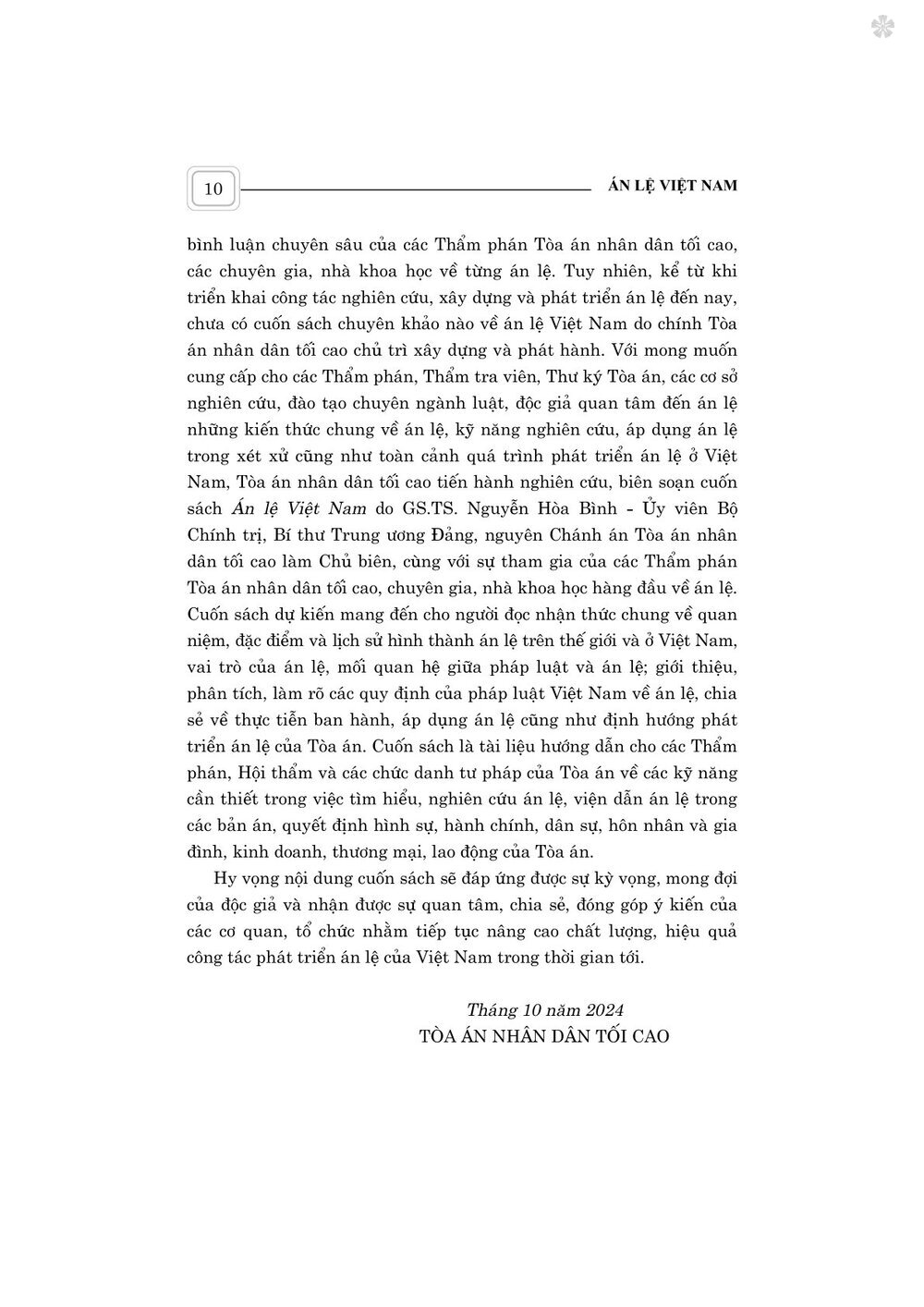 Trên cơ sở khái quát quá trình phát triển án lệ ở Việt Nam và kinh nghiệm xây dựng, áp dụng án lệ ở một số quốc gia trên thế giới, cuốn sách chuyên khảo Án lệ Việt Nam phân tích thực trạng áp dụng án lệ trong thực tiễn xét xử và khuyến nghị một số giải pháp nhằm nâng cao chất lượng quá trình nghiên cứu, đề xuất, công bố và áp dụng án lệ. Ngoài 3 chương chính, phần phụ lục của cuốn sách giới thiệu toàn văn 72 án lệ đã được công bố và phát triển từ các bản án, quyết định của Tòa án nhân dân các cấp.