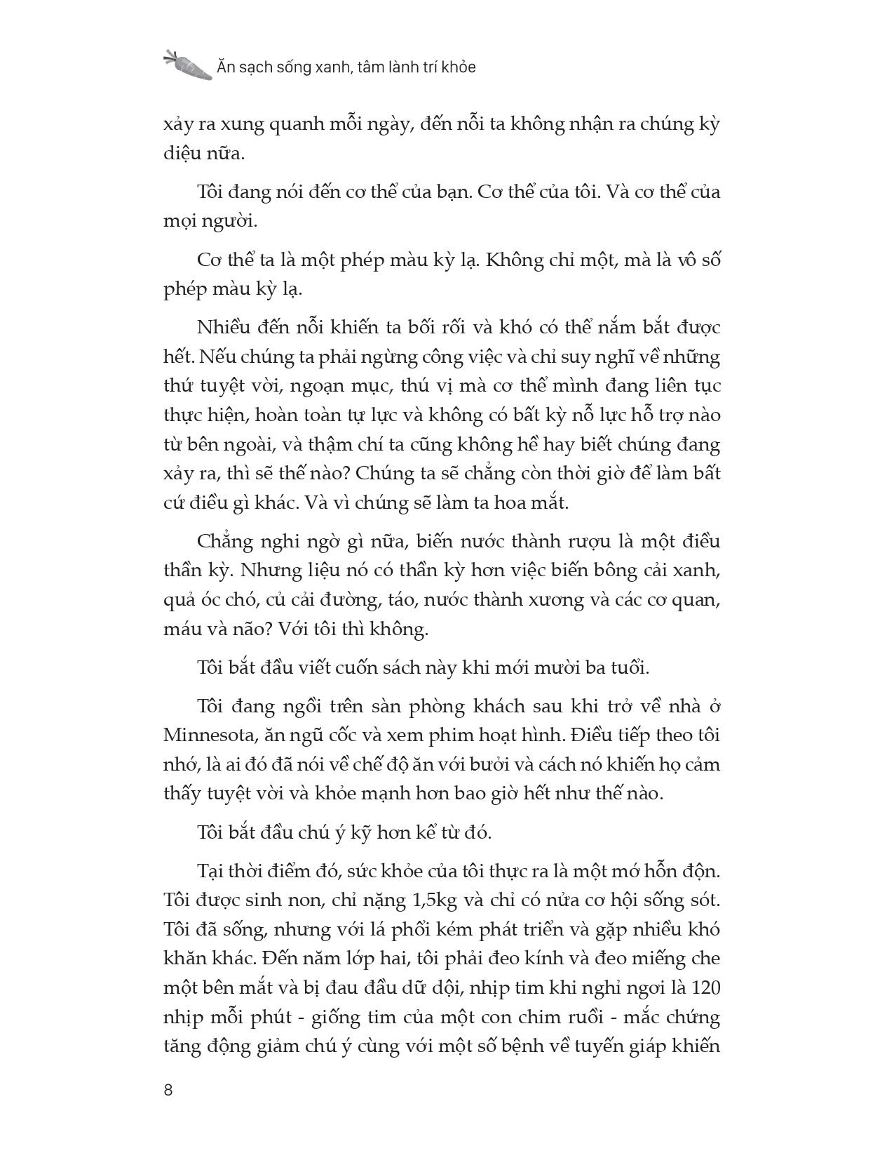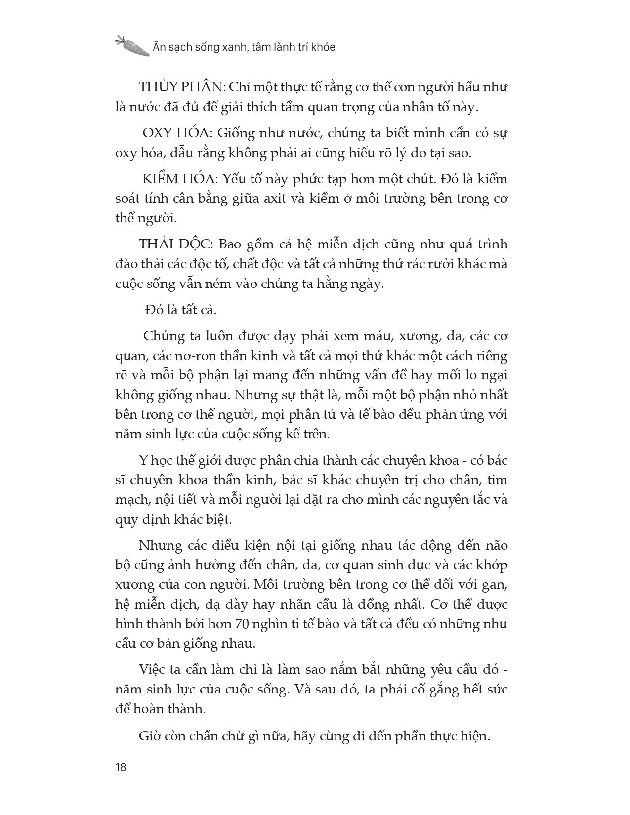 Trong Ăn sạch sống xanh, tâm lành trí khỏe, Darin Olien cung cấp cho chúng ta một cách suy nghĩ hoàn toàn mới về sức khỏe và hạnh phúc bằng cách xác định các động lực sống: Dinh dưỡng chất lượng, Hydrat hóa, Giải độc, Oxy hóa và Kiềm hóa, cho chúng ta biết cách duy trì cân nặng hợp lý, ngăn ngừa ngay cả những căn bệnh nghiêm trọng nhất. Chúng ta luôn được dạy phải xem máu, xương, da, các cơ quan, các nơ-ron thần kinh và tất cả mọi thứ khác một cách riêng rẽ và mỗi bộ phận lại mang đến những vấn đề hay mối lo ngại không giống nhau. Nhưng sự thật là, mỗi một bộ phận nhỏ nhất bên trong cơ thể người, mọi phân tử và tế bào đều phản ứng với năm sinh lực của cuộc sống kể trên. Việc ta cần làm chỉ là làm sao nắm bắt những yêu cầu đó - năm sinh lực của cuộc sống. Và sau đó, ta phải cố gắng hết sức để hoàn thành.
