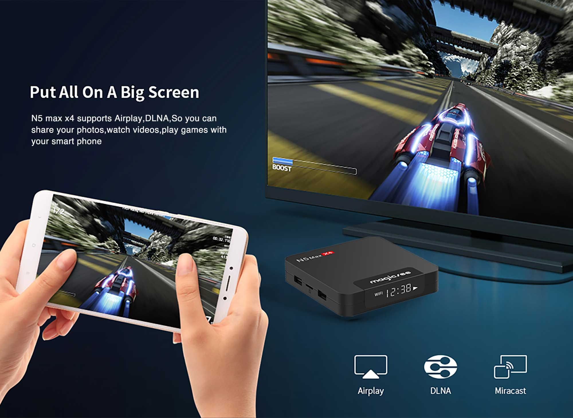 • Chỉ cần nói tên bài hát hoặc nội dung cần tìm sẽ ra kết quả từ Google     Amlogic S905X4 Amlogic S905X4 áp dụng bộ xử lý lõi tứ Cortex-A55, nó là "bộ xử lý ứng dụng tiên tiến được thiết kế cho các n5 max x4 OTT / IP Set-Top Box (STB) cao cấp. Các lõi Cortex-A55 cung cấp tới hai lần hiệu suất so với Cortex-A53 về điểm chuẩn bộ nhớ và cải thiện hiệu suất 20 đến 30% điển hình hơn cho các tác vụ thông thường ở cùng tần số. Hệ điều hành Android 11 Nó dựa trên hệ điều hành Android 11 mới nhất, với tốc độ cao và hiệu năng mượt mà, được thiết kế để biến TV thông thường của bạn thành một tivi thông minh. Độ phân giải 8K UHD Độ phân giải hình ảnh thật 8k có thể lên tới 7680 4320 để đạt được độ chính xác gấp 16 lần hình ảnh 1080p. USB 3.0 Tốc độ đọc / ghi cao. USB 3.0 có tốc độ tối đa 5 gigabit mỗi giây, về mặt lý thuyết nhanh hơn mười lần so với USB 2.0. WiFi băng tần kép 2.4G / 5G Với sự hỗ trợ cho băng tần 2.4Ghz và 5Ghz, nó có thể truyền lượng dữ liệu cao hơn. Thiết bị xem phim Full HD cõ hỗ trợ xem phim 4K cho các dòng TV cao cấp n5 max x4 được thiết kế không khác gì một chiếc điện thoại cao cấp ngoại trừ tính năng nge và gọi. Các bạn có thể vào mạng, lướt web, xem phim, xem bóng đá, đọc tin tức. Thiết bị n5 max x4 sẽ thay thế và bổ trợ cho các dòng TV đã là Smart Tv hoặc chỉ là TV thông thường. Đặc biết các bạn có thể thoải mái truy cập vào kho ứng dụng CH PAY của Google tải bất kỳ ứng dụng nào muốn vè TV nhà bạn. Google tải bất kỳ ứng dụng nào muốn vè TV nhà bạn.   TẤT CẢ ĐÃ CÓ TRONG THIẾT BỊ ANDROID TV  Về mặt trước nổi bật trên mặt sản phẩm là Logo Magicsee N5 max X4 được in nổi chính là điểm ấn tượng đầu tiên Sản phẩm có thiết kế nhỏ gọn với chiều ngang 10.5, chiều dài 10.5, chiều cao 2.8cm . android tivi box cũng chạy trên Android 11 Như đã thấy, ở mặt sau vẫn là cách bố trí các cổng kết nối quen thuộc, bao gồm 2 cổng USB ,1 khe thẻ, 1x AV, 1 cổng HDMI, cổng mạng JR45 và một cổng nguồn DC 5V-2A,  cổng âm thanh số n5 max x4 hiện đang là sản phẩm được ưu chuộng trên thị trường không những bởi hiệu suất tuyệt vời của nó mà con do thiết kế . Với thiết kế mang phong cách cách của 1 siêu phẩm sản phẩm chỉ nhỏ gọn bằng 1 chiếc smart phone mang đến sự hiện đại và sang trang cho ngôi nhà bạn.       CPU : Amlogic S905X4 64-bit Quad Core ARM Cortex A55 CPU GPU : G31 MP2 Bộ xử lý GPU Bộ nhớ LPDDR4: 4GB Rom: 32GB Wifi :IEEE 802.11 A/B/g/n/AC; 2.4G / 5G Hệ điều hành : Android 11 Bluetooth  1 HDMI,HD 2.1, Hỗ Trợ HD CEC, HDR và và 8K x 4K @ 24 Độ phân giải đầu ra  1 AV OUT 480i/576i tiêu chuẩn đầu ra độ nét  3 USB 1 USB 3.0 ; 2 USB 2.0  1 Giao Diện Ethernet; Hỗ Trợ 10/100M 1 TF Hỗ trợ 4GB / 16GB / 32GB / 64GB TV abbreviation TV, tivi