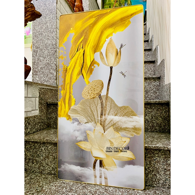 Tranh treo tường tráng gương hiện đại hoa sen vàng