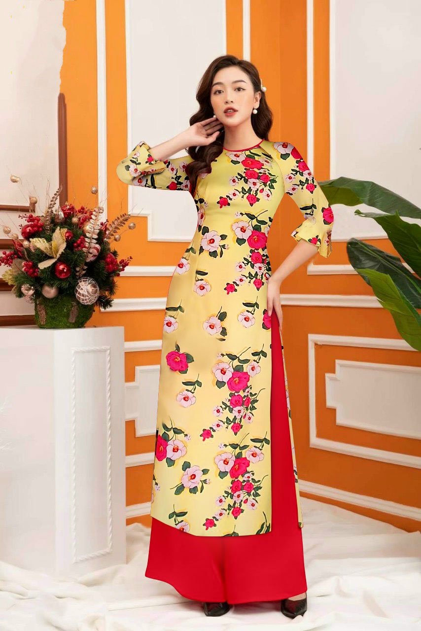 Thiết kế Áo dài nữ họa tiết hoa lá vàng đỏ cao cấp phong cách đường may tỉ mỉ.