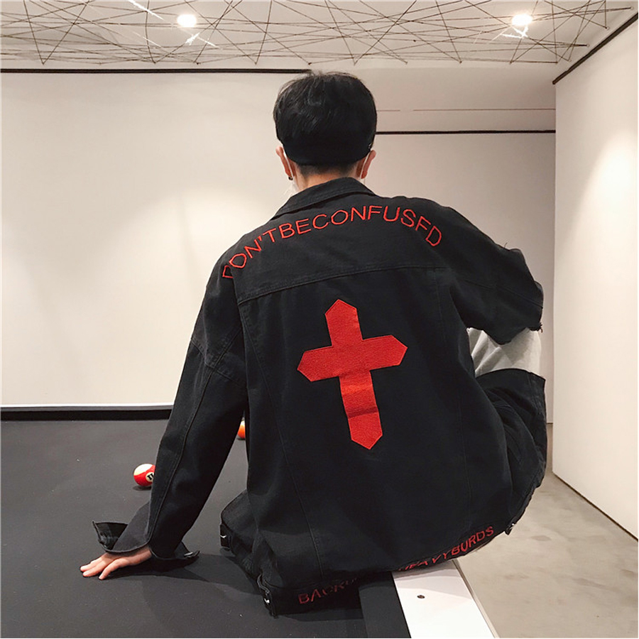 Áo khoác jeans nam đen chữ thập đỏ A293 MuiDoi | áo khoác | áo khoác jeans