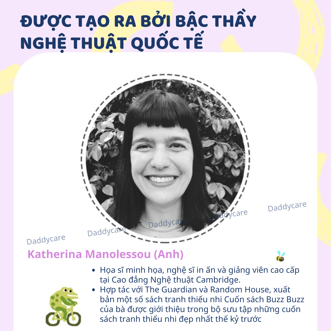 - ĐƯỢC TẠO RA BỞI BẬC THẦY NGHỆ THUẬT QUỐC TẾ: Katherina Manolessou (Anh) Họa sĩ minh họa, nghệ sĩ in ấn và giảng viên cao cấp tại Cao đẳng Nghệ thuật Cambridge. Hợp tác với The Guardian và Random House, xuất bản một số sách tranh thiếu nhi Cuốn sách Buzz Buzz của bà được giới thiệu trong bộ sưu tập những cuốn sách tranh thiếu nhi đẹp nhất thế kỷ trước