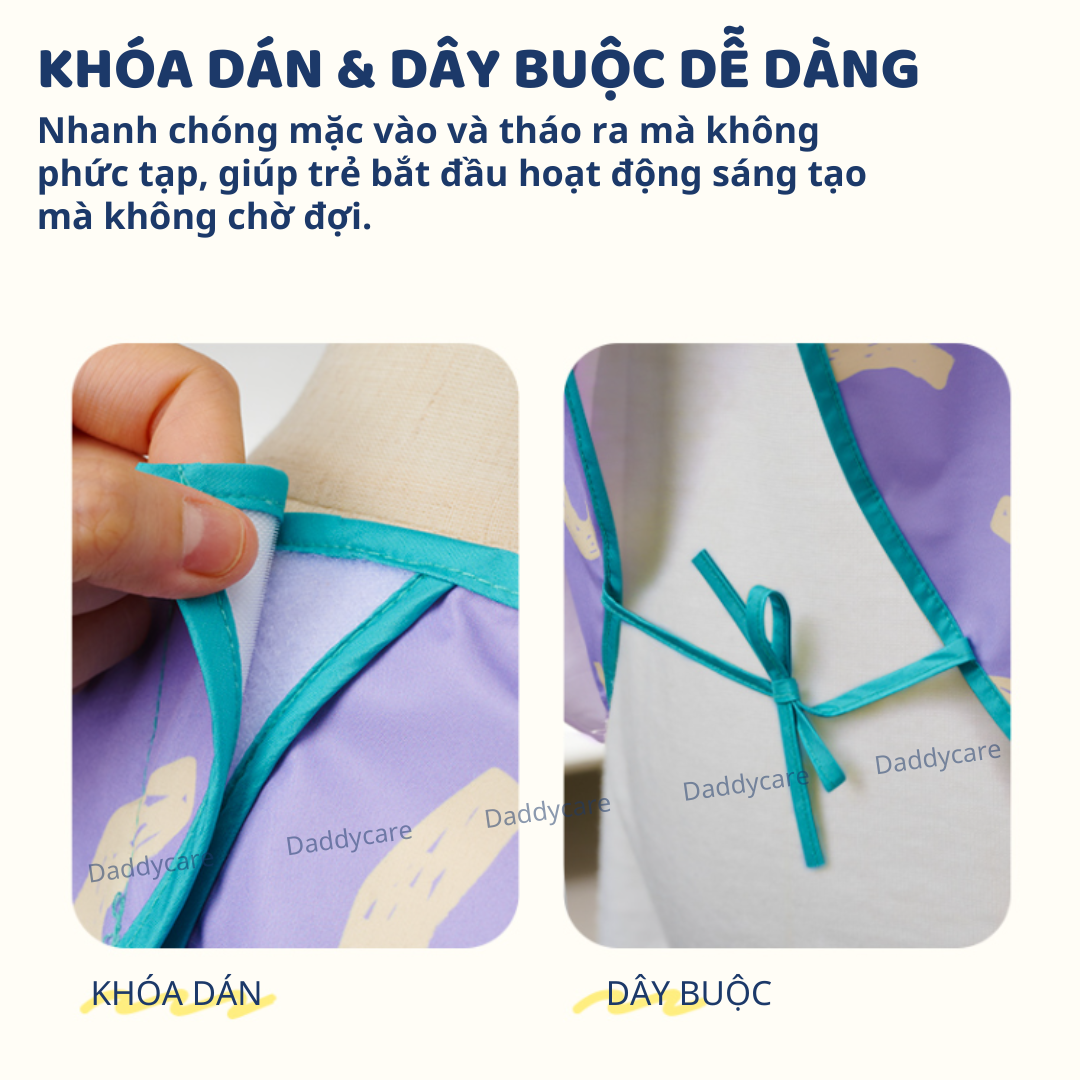 - KHÓA DÁN & DÂY BUỘC DỄ DÀNG: Nhanh chóng mặc vào và tháo ra mà không phức tạp, giúp trẻ bắt đầu hoạt động sáng tạo mà không chờ đợi.