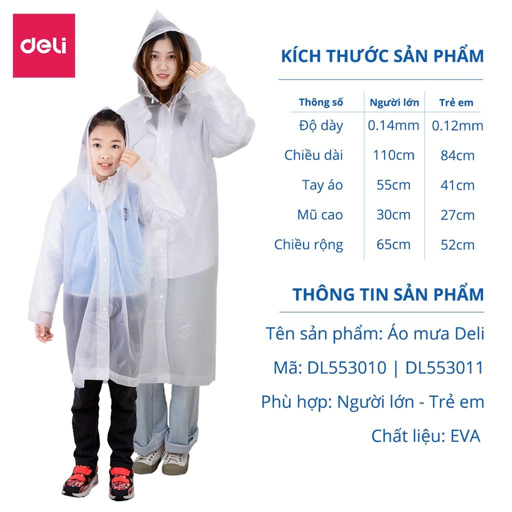ÁO MƯA TRONG SUỐT DELI THÔNG TIN SẢN PHẨM - Hãng sản xuất: DELI - Mã sản phẩm: DL553010 / DL553011 - Chất liệu: Nhựa PVC chống thấm nước - Kiểu dáng: Áo đơn