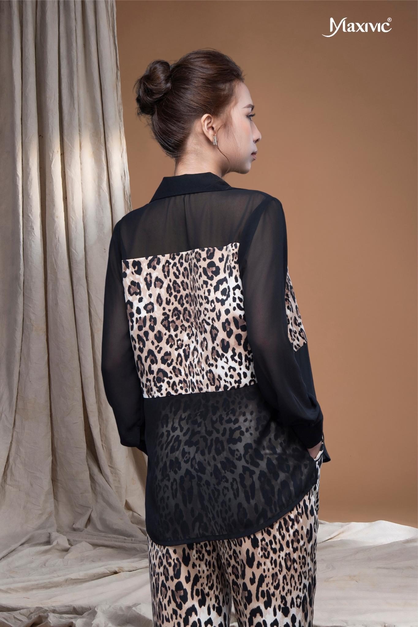 Thiết kế áo sơmi lụa voan đen xuyên thấu phối cùng hoạ tiết da beo tạo điểm nhấn, mang lại diện mạo quyến rũ và cá tính.