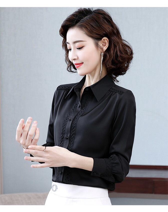 Áo Sơ Mi Phi Lụa Thanh Lịch Cổ Tim Viền Ren - Kiểu dáng: áo sơ mi công sở cổ tim thanh lịch, viền ren sang trọng, tay dài, viền ren bo tay cài nút