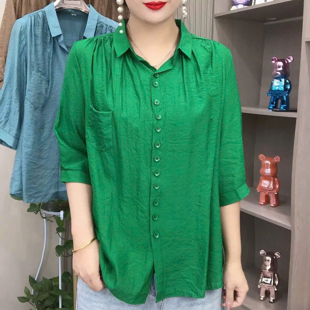 CHẤT LIỆU LỤA ÁO MÀU XANH LÁ / HỒNG / ĐỎ / ĐEN / XÁM / TRẮNG ÁO SOMI NẸP GIẤU NÚT FORM RỘNG FREESIZE ĐIỂM NHẤN 1 BÊN TAY PHẢI ÁO GẮN TAG LOGO