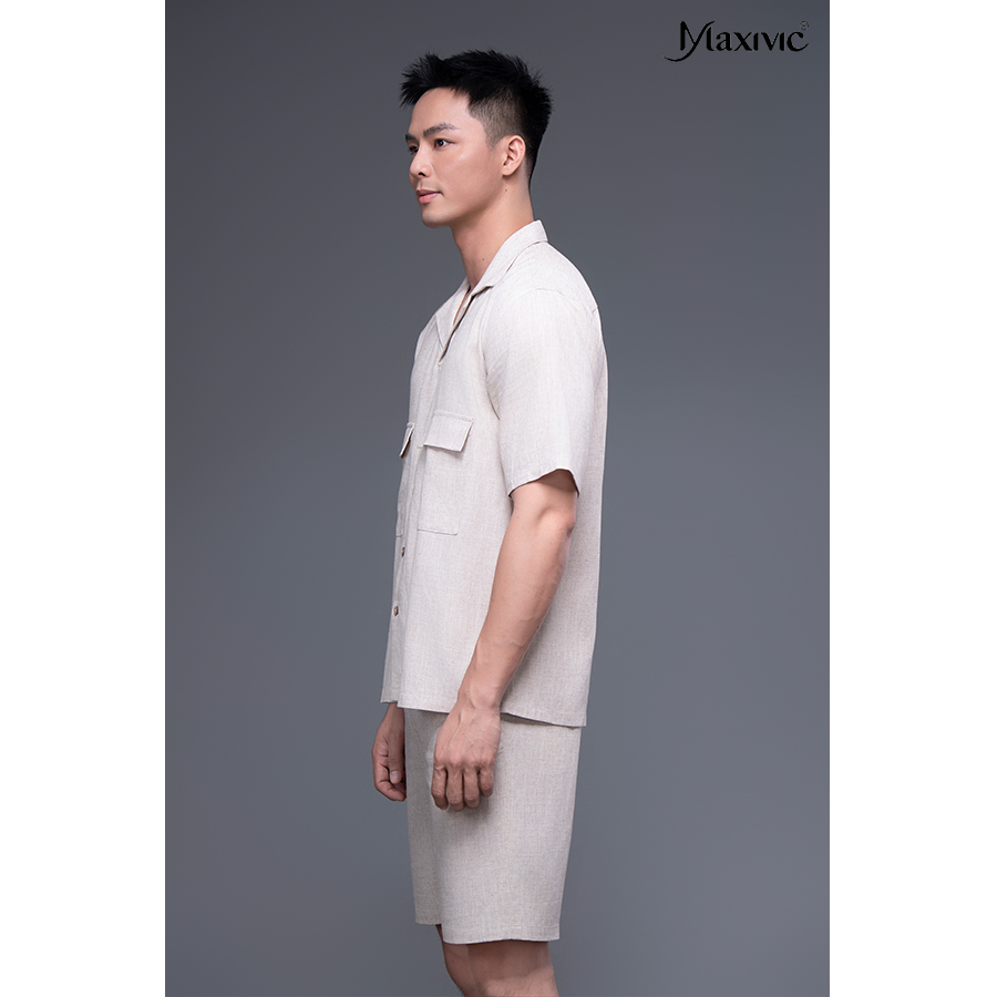 - Áo sơmi linen màu be kem cùng phần nắp túi giả, mang lại vẻ ngoài phóng khoáng và sang trọng cho người mặc