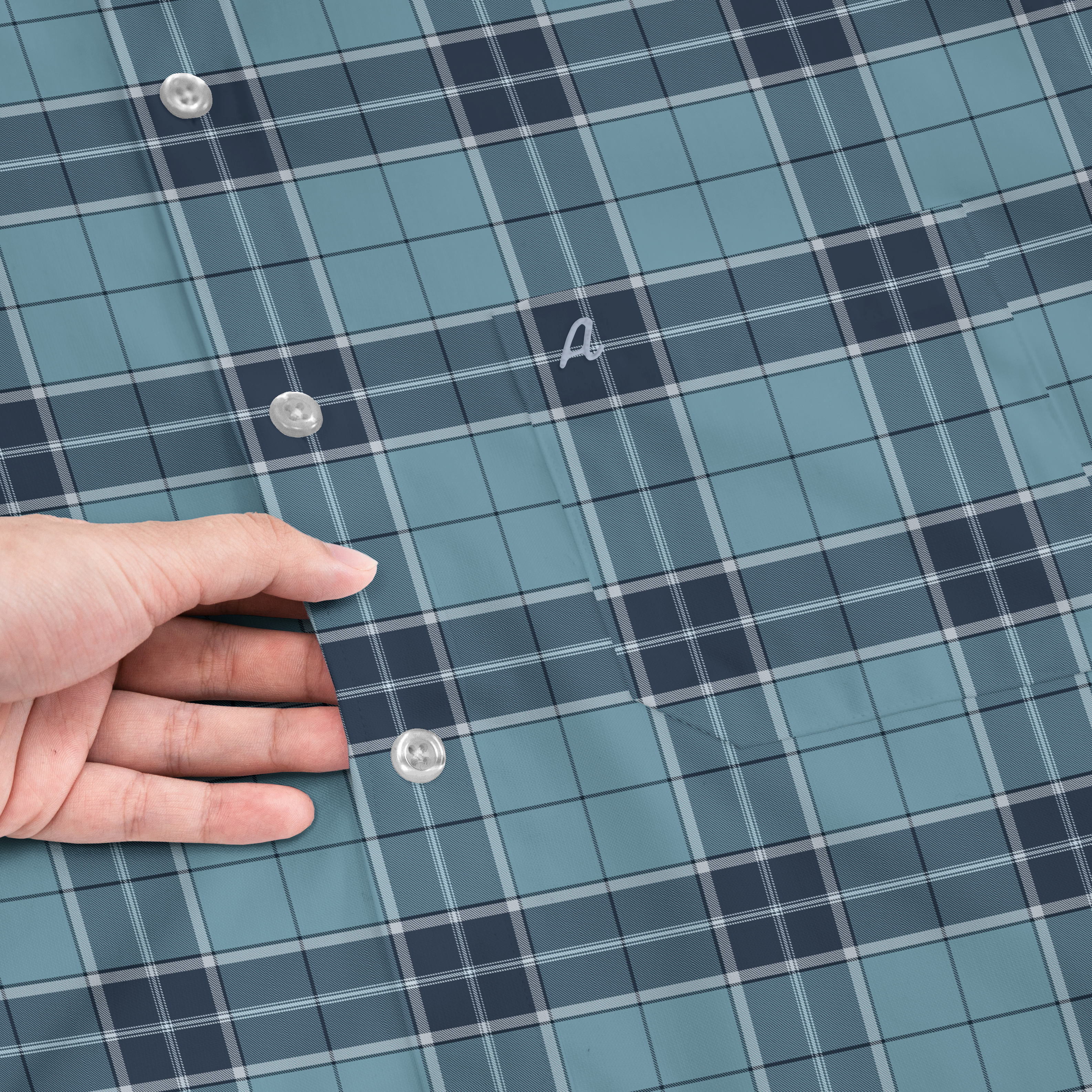 Khởi động ngày mới cùng Thời trang Khatoco Áo sơ mi kẻ caro xanh trắng với sự kết hợp màu sắc hài hòa giữa xanh trời nhẹ nhàng, chút trắng tinh tế đem lại sự