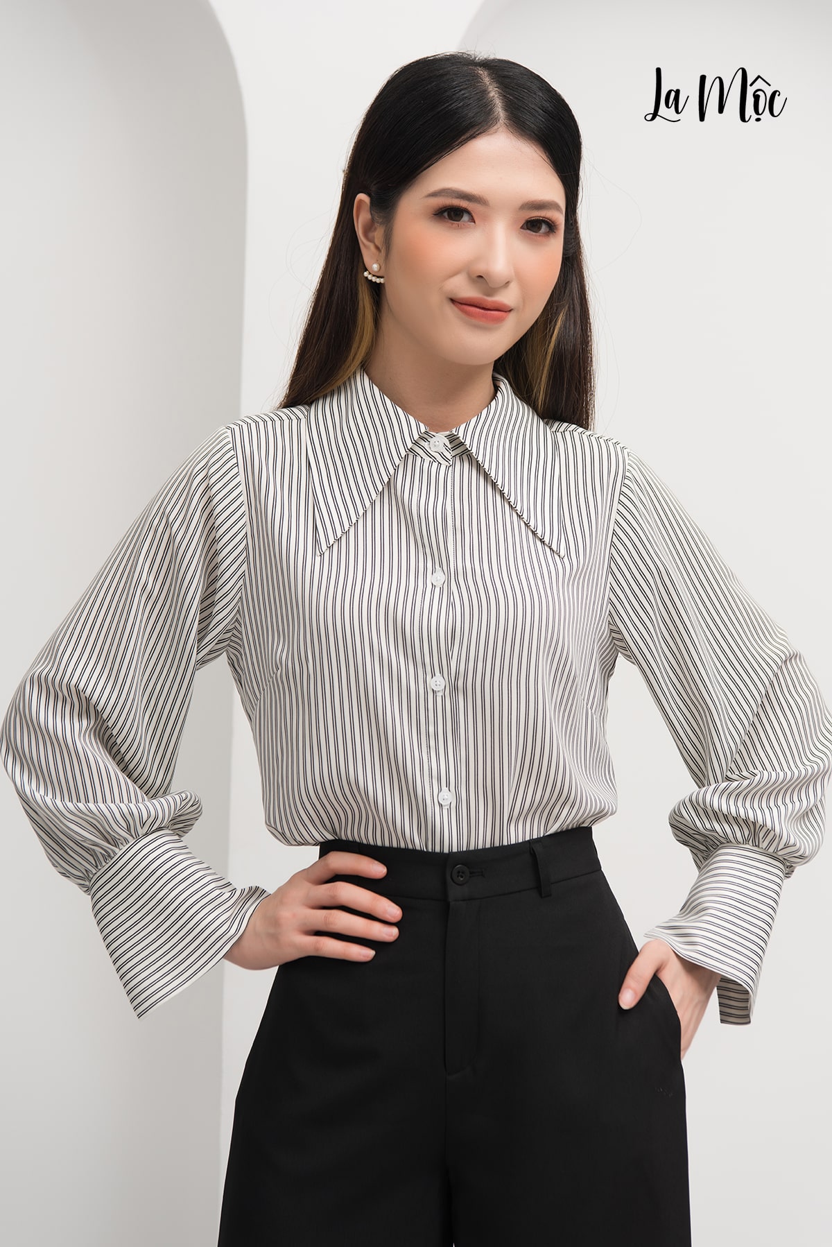 Áo sơ mi sọc tay xẻ La Mộc chất liệu lụa Korea là mẫu thiết kế dành riêng cho những cô nàng ưa thích sự sành điệu.