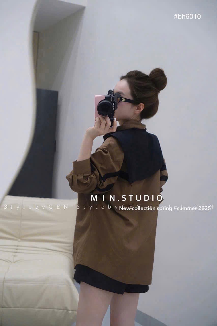 CHẤT LIỆU VẢI NÂU DA - COTTON PHA, BỀ MẶT MỀM ÊM ÁO MÀU NÂU DA PHỐI ĐEN FORM RỘNG FREESIZE ĐIỂM PHẤN PHẦN PHỐI KẺ SỌC GIỮA TRƯỚC NẸP ÁO, VÀ GIỮA SAU THÂN