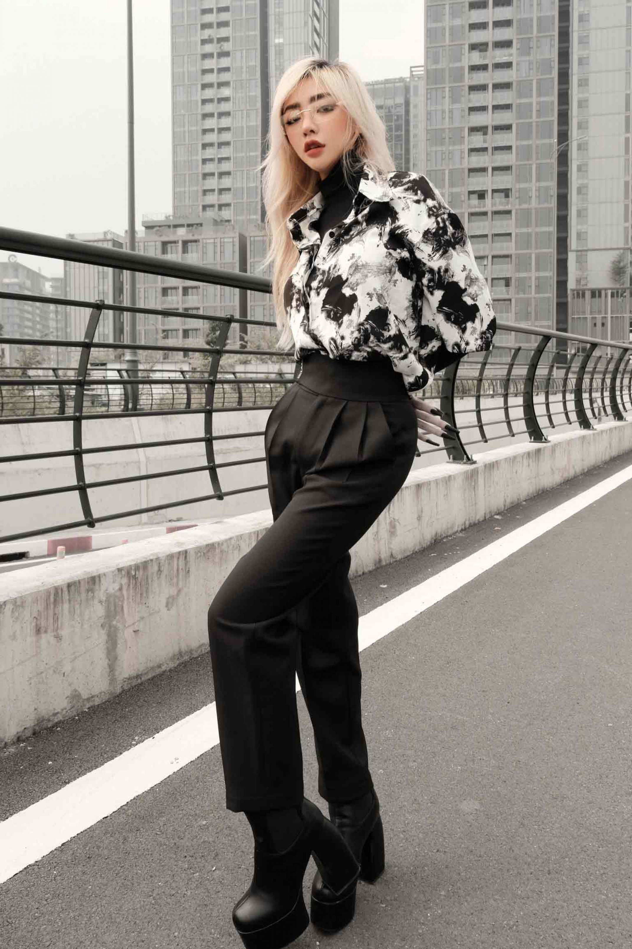 CHẤT LIỆU MANGO, MỀM MƯỢT, KHÔNG NHĂN ÁO MÀU TRẮNG, HOẠ TIẾT MÀU ĐEN ÁO SOMI NẸP GIẤU NÚT FORM RỘNG FREESIZE ĐIỂM NHẤN 1 BÊN TAY PHẢI ÁO GẮN TAG LOGO LAAS