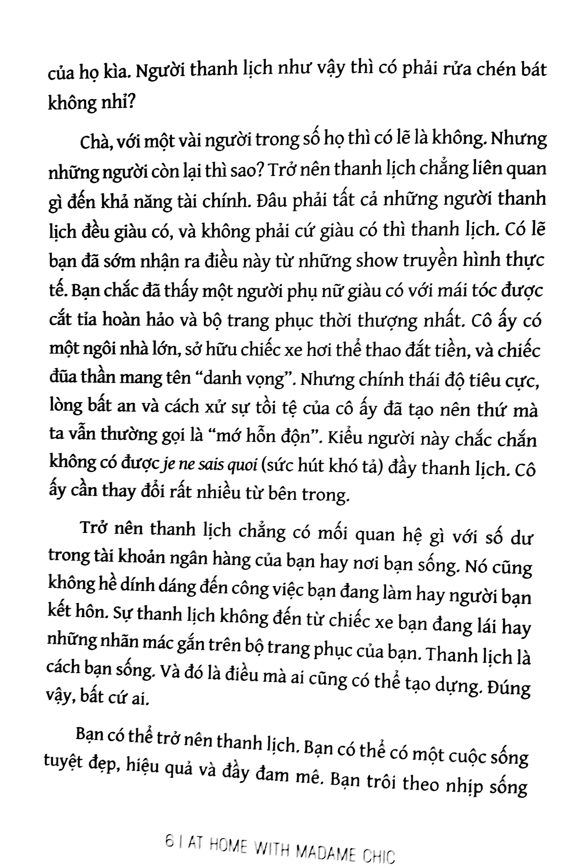 “Bạn có thể nghĩ rằng, sự thanh lịch chẳng liên quan gì đến những khoảnh khắc rất đỗi đời thường như chuẩn bị bữa ăn, dọn dẹp bát đĩa hay thanh toán hóa đơn. Nhưng điều bí mật là: Những khoảnh khắc này không tầm thường một chút nào. Au contraire (Ngược lại). Chúng mang đầy ý nghĩa. Nếu bạn thay đổi thái độ của mình ngay từ những việc nhỏ nhất – bạn có thể thay đổi hoàn toàn cuộc sống của chính mình.”