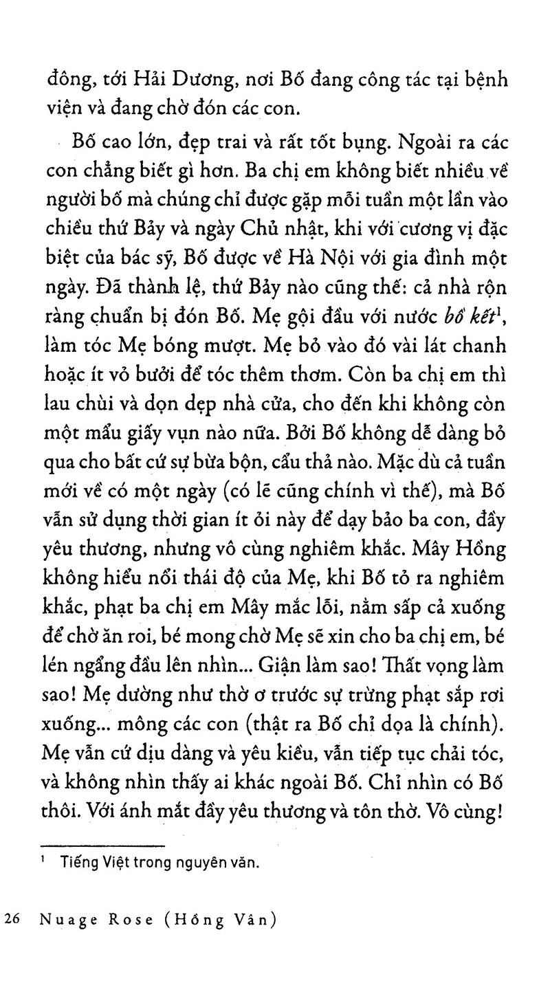 Trong cuốn tự truyện mang màu sắc của một tiểu thuyết này, tác giả người Pháp gốc Vitệ Nuage Rose (Hồng Vân) kể về những năm tháng rời Hà Nội theo gia đình đi sơ tán. Giữa những u ám, đói khát và sợ hãi mà chiến tranh gieo rắc, là lấp lánh tình yêu. Chọn cách kể những câu chuyện nhỏ của những người bình thường trong lịch sử phi thường của đất nước bằng văn phong đầy nhạc tính, khi trầm ngâm suy tư, khi hồn nhiên hóm hỉnh, Nuage Rose - hay áng Mây Hồng - không ngừng khiến bạn đọc ngạc nhiên, khóc cười và suy ngẫm về một thế giới tưởng chừng đã mất.